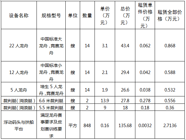 为充分发挥汉源龙舟等水上运动器材设备设施的作用,提高器材使用价值,推动汉源县体育事业持续健康有序发展,根据《行政事业单位国有资产管理办法》等相关文件规定,经研究决定,将我县水上运动器材及设备设施对外租赁。现将租赁公告如下: