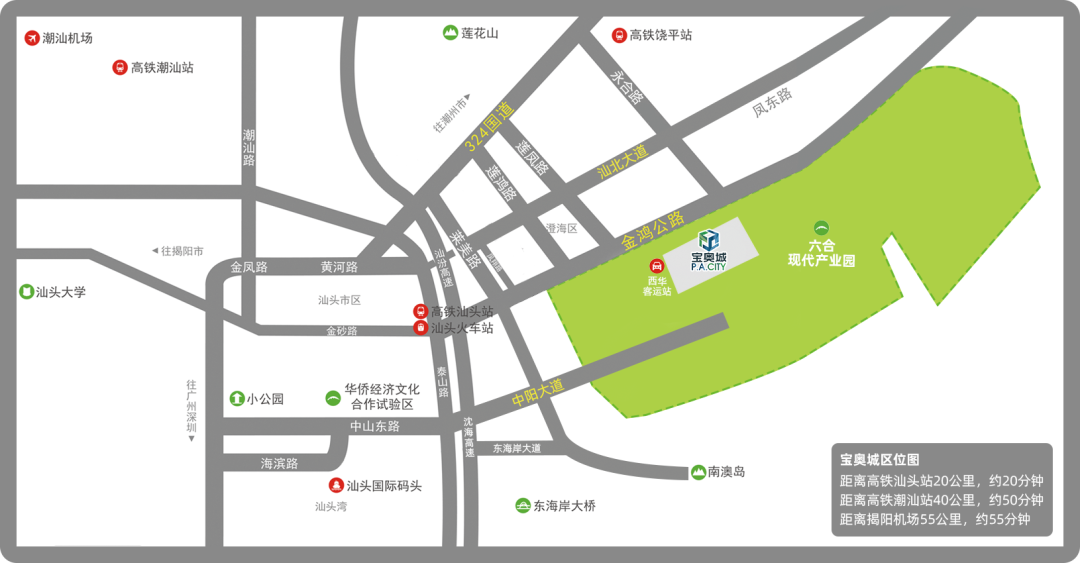 宝奥玩具文旅产业园依托“宝奥国际玩具城”(简称:宝奥城)项目,位于汕头市澄海区金鸿公路边,占地面积约15万平方米,是集文化旅游、旅居度假、餐饮娱乐、产品展示、特色购物为一体的特色旅游服务景点。