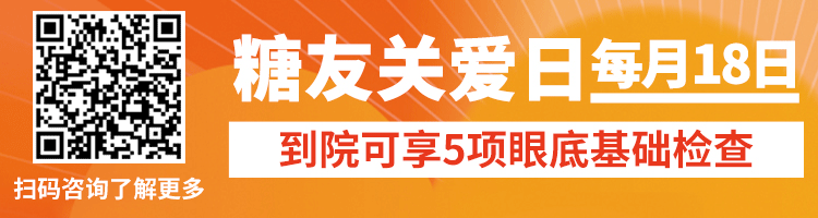 每月18日为糖友关爱日,市民朋友凭糖尿病诊断(血糖报告等)到院眼健康管理部,可享受基础眼底检查(含视力、眼压、电脑验光、眼底照片、裂隙灯5个项目)。