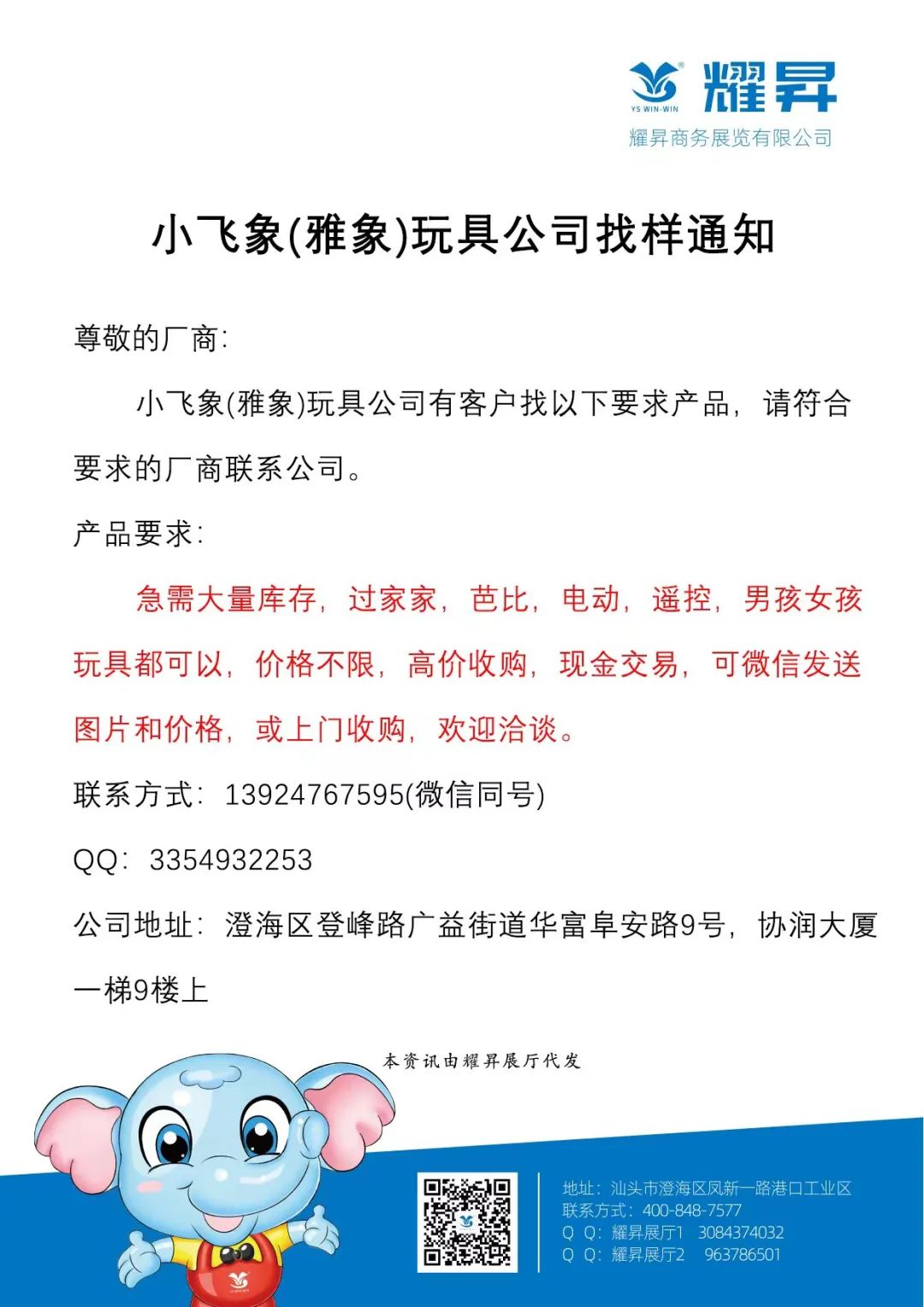 通知|小飞象(雅象)玩具公司找样通知