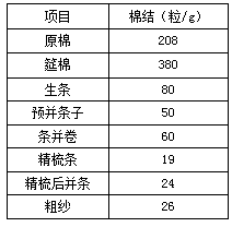 应用Afis分别对原棉、开清棉、梳棉、精梳等工序的半制品进行了大量而细致的测试,从原棉到粗纱各工序半制品中的棉结含量进行了多次试验。(各工序棉结含量变化情况如表1所示)。