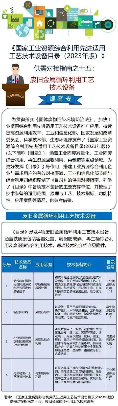 国家工业资源综合利用先进适用工艺技术设备目录(2023年版)供需对接指南之十五:废旧金属循环利用工艺技术设备