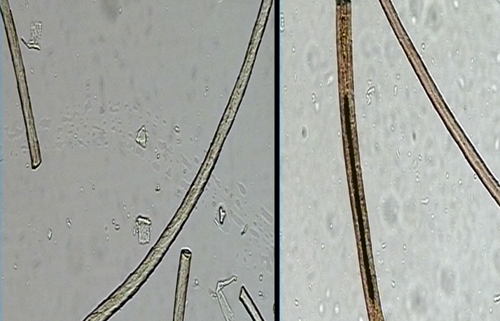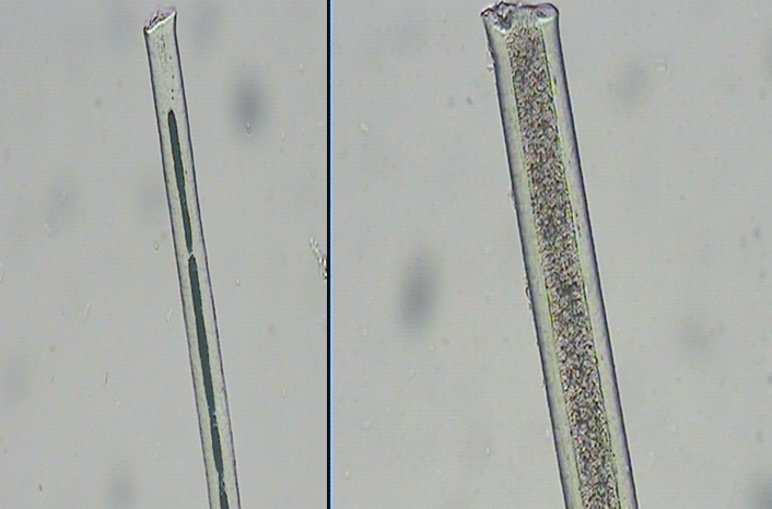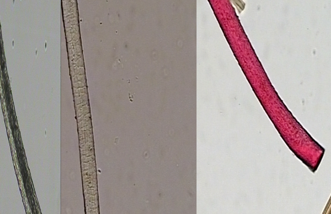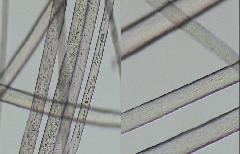 (6)羊驼毛:直径较粗,鳞片呈环状或斜条状,紧抱毛干,有圆形髓腔,髓腔很发达。
