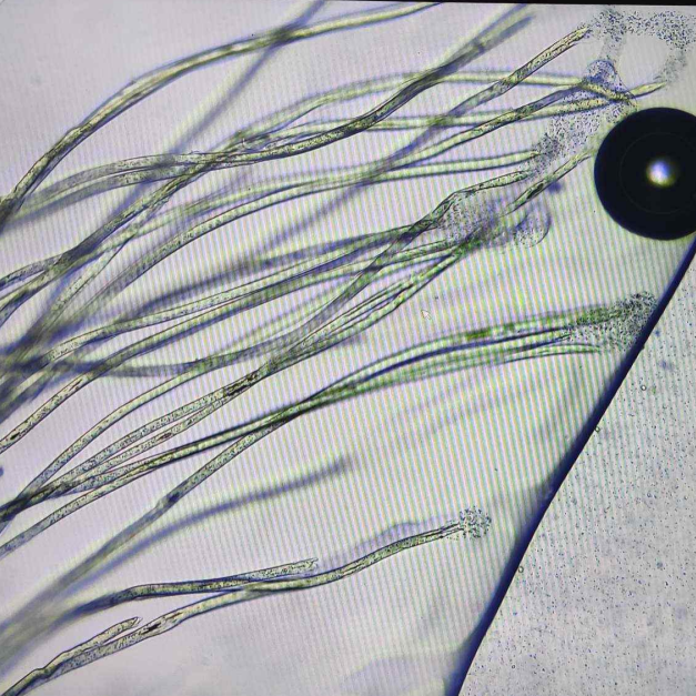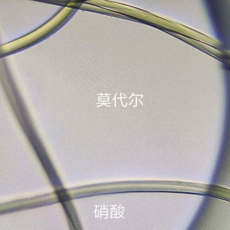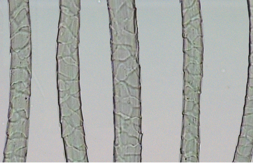 (2)马海毛:鳞片扁平呈瓦状覆盖,排列整齐,鳞片很薄,紧贴毛干、很少重叠。部分马海毛表面有很多斑点,这也是其典型特征之一。
