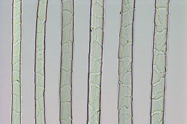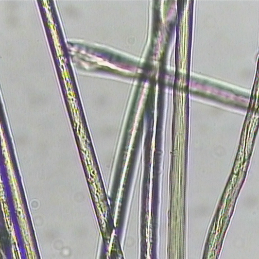 (3)莫代尔纤维:纵向截面平滑有光泽有沟槽。