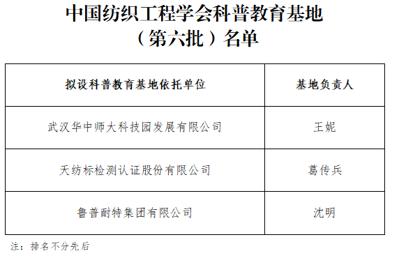 按照《中国纺织工程学会科普教育基地管理办法》要求,经评议和公示,决定授予武汉华中师大科技园发展有限公司等3家单位(机构)为第六批中国纺织工程学会科普教育基地(见附件),有效期5年(2023年8月—2028年7月)。 刘 丹 18811069084/010-65925745 白 洁 18810479705/010-65925475邮 箱:biaozhunchu@ctic.org.cn地 址:北京朝阳区延静里中街3号主楼6层(100025)
