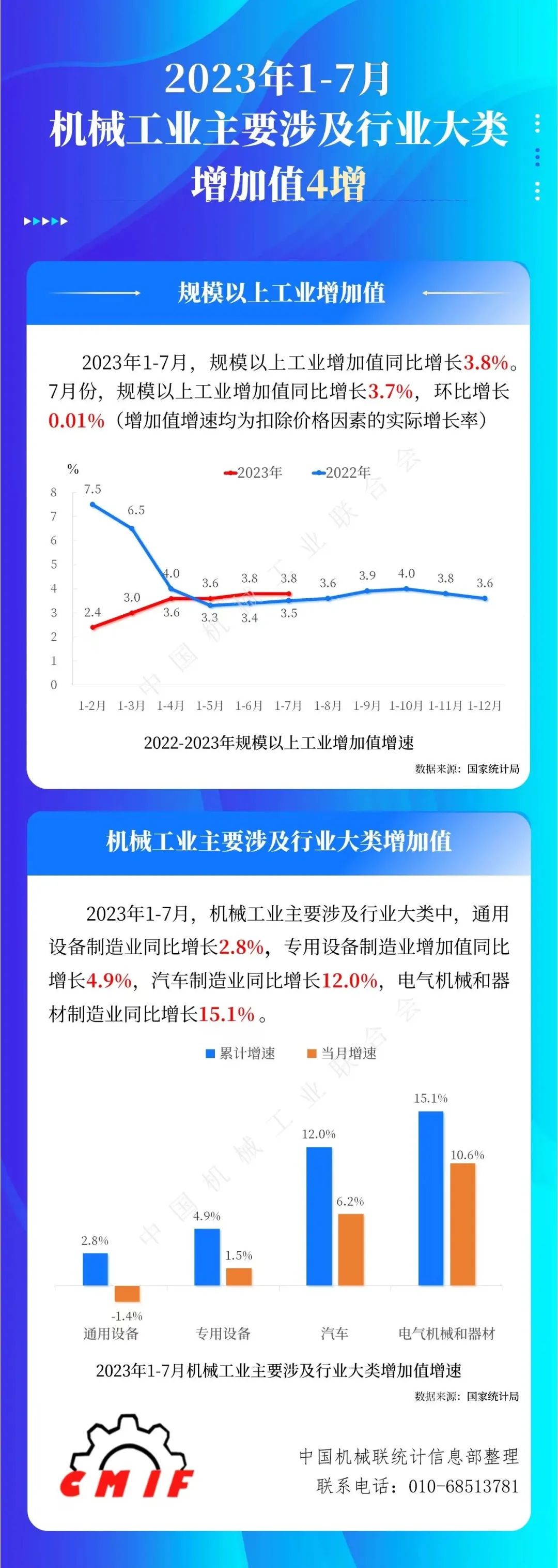 【行业数据】2023年1-7月机械工业主要涉及行业大类增加值4增