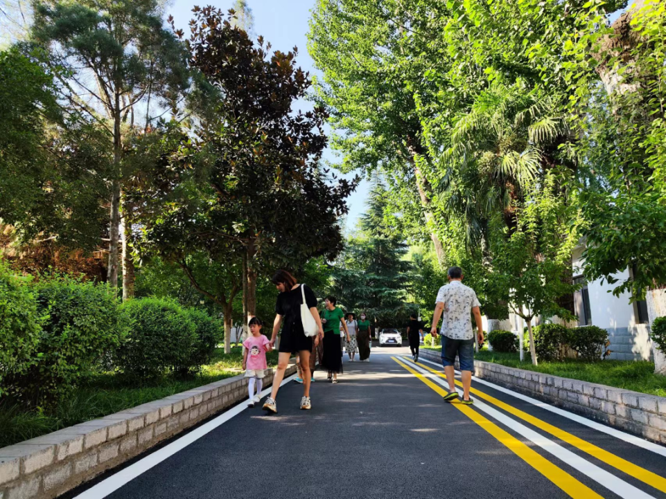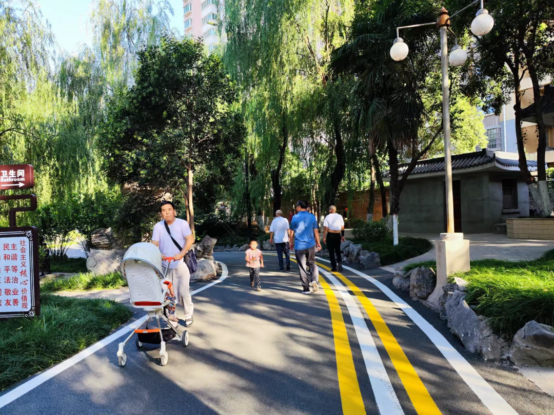 纺织公园环湖道路原来是混凝土路面,年久失修,道路破损,坑洼不平。公园对原有破损混凝土路面进行修补,在原水泥路面上铺装4-5厘米厚彩色沥青砼面层1940平方米,路面喷涂标志线等。步道改为沥青面层后,材质的柔性和防滑性充分保障了运动的安全性和舒适性。步道全长310米,宽度为4-6米。路面宽阔平坦,线条流畅优美,像一条灰色长龙蜿蜒盘旋在湖光山色间,黄白相间的标识线鲜亮醒目,活力四射,吸引游人纷纷前来,给运动、休闲、散步、遛娃带来惊喜体验。