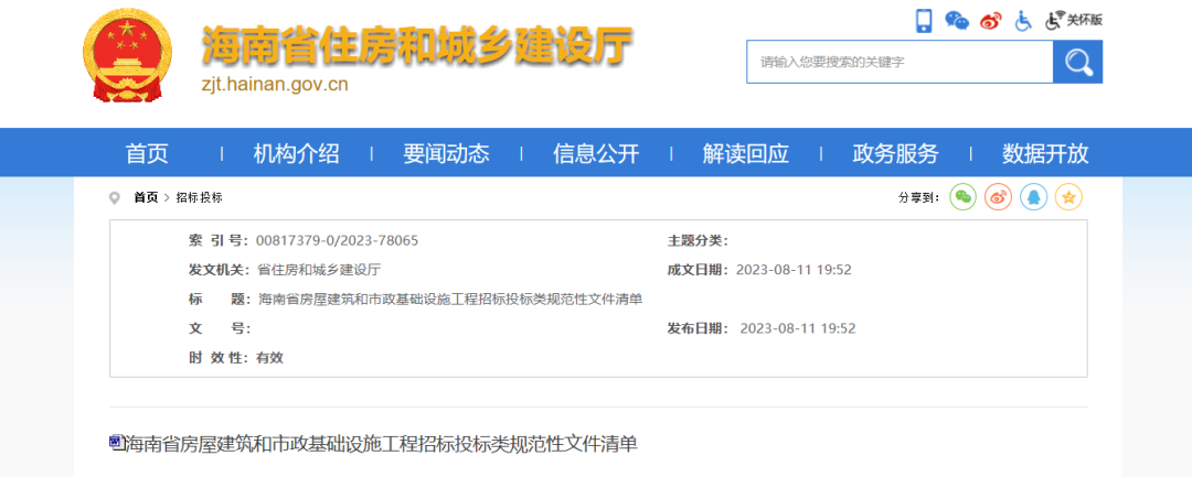 | 14 | 关于取消房屋建筑和市政基础设施工程施工招标文件事前备案并做好相关工作的通知(琼建规〔2019〕1号) | http://zjt.hainan.gov.cn/szjt/gfxwj/201907/89750aed08af44b8be76f9783b89c761.shtml |