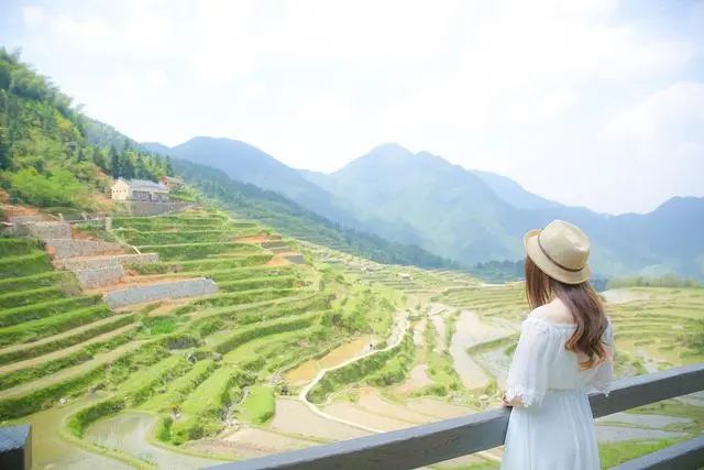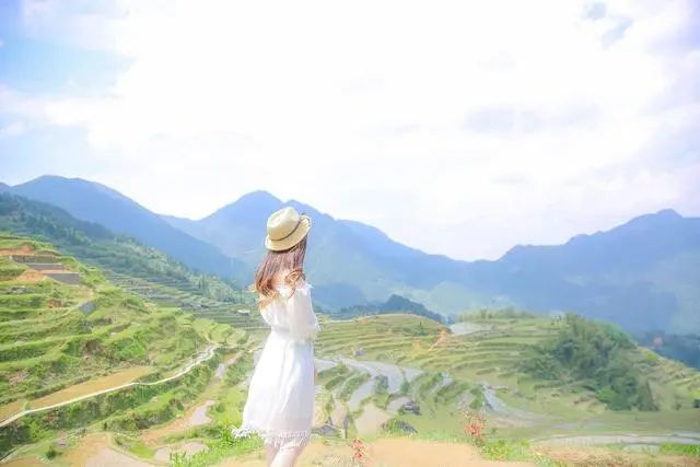 来到一个有山有水的山区,远处的大山和近处的田园形成一道美丽的风景线,再这样的美景下,美女怎能放弃拍照的机会呢!这时美女可以站在一条长长的大桥上,双手放在大桥的护栏上,眼睛看向桥对面的田园和大山,这样拍照非常美。