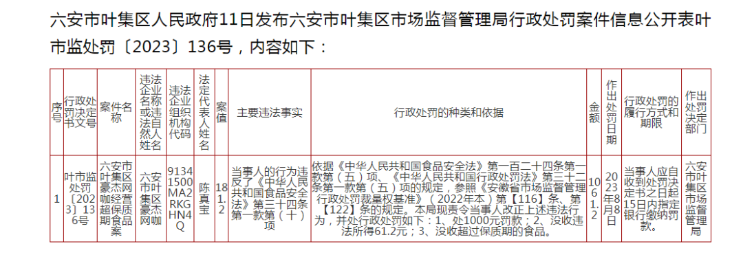 六安市叶集区人民政府11日发布六安市叶集区市场监督管理局行政处罚案件信息公开表叶市监处罚〔2023〕136号,内容如下: