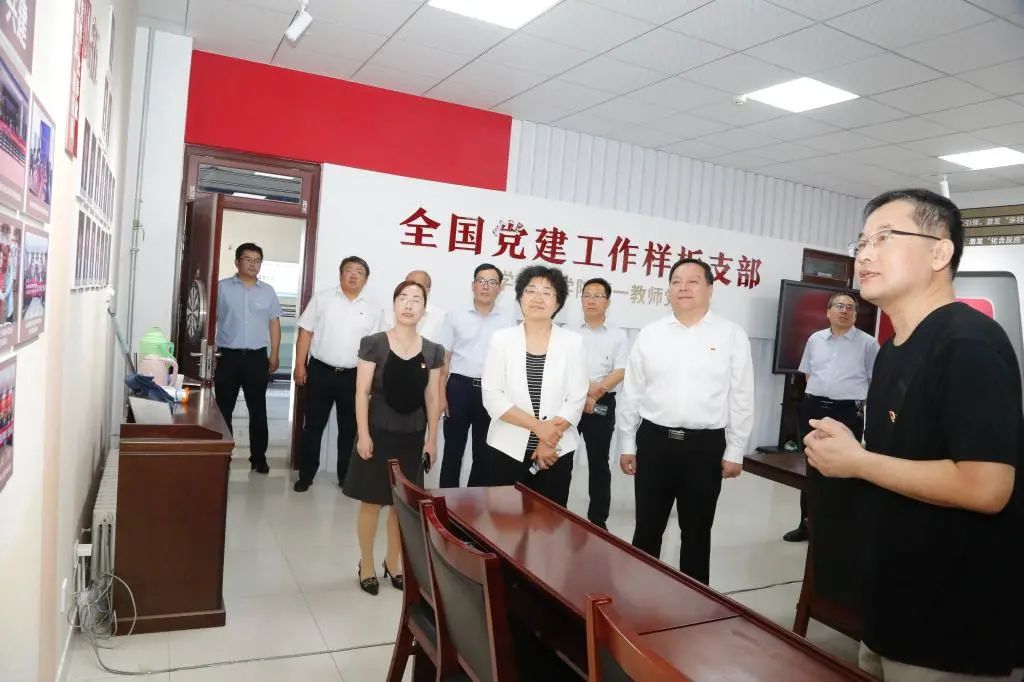 6月29日,省委主题教育第二十一巡回指导组副组长崔晓红,指导组成员杨大胜、周彬彬、宋茂晋到全国样板党支部——化学化工学院第一教师党支部指导工作,校领导车滨、王金利陪同参观。