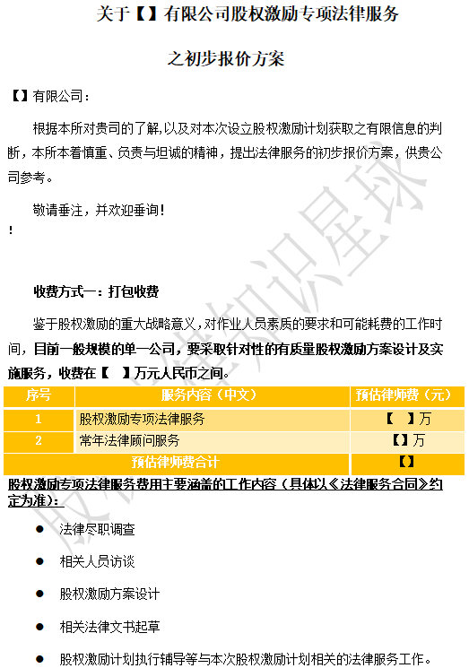 "获取股权激励专项法律服务之初步报价方案word版及其它股权法律文件,只需加入股权法律知识星球。新成员可领200元优惠券,劵后加入仅需99元(一顿午餐或两杯星巴克),即可全年享受每周更新的股权资料范本文件分享。优惠数量有限,先到先得。详情请查阅下图。"
