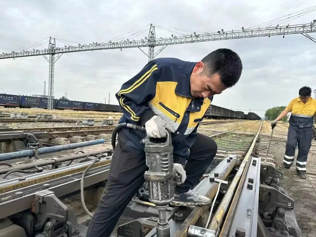 包西驼峰车间副工长秦岭正在紧固制动轨螺栓
