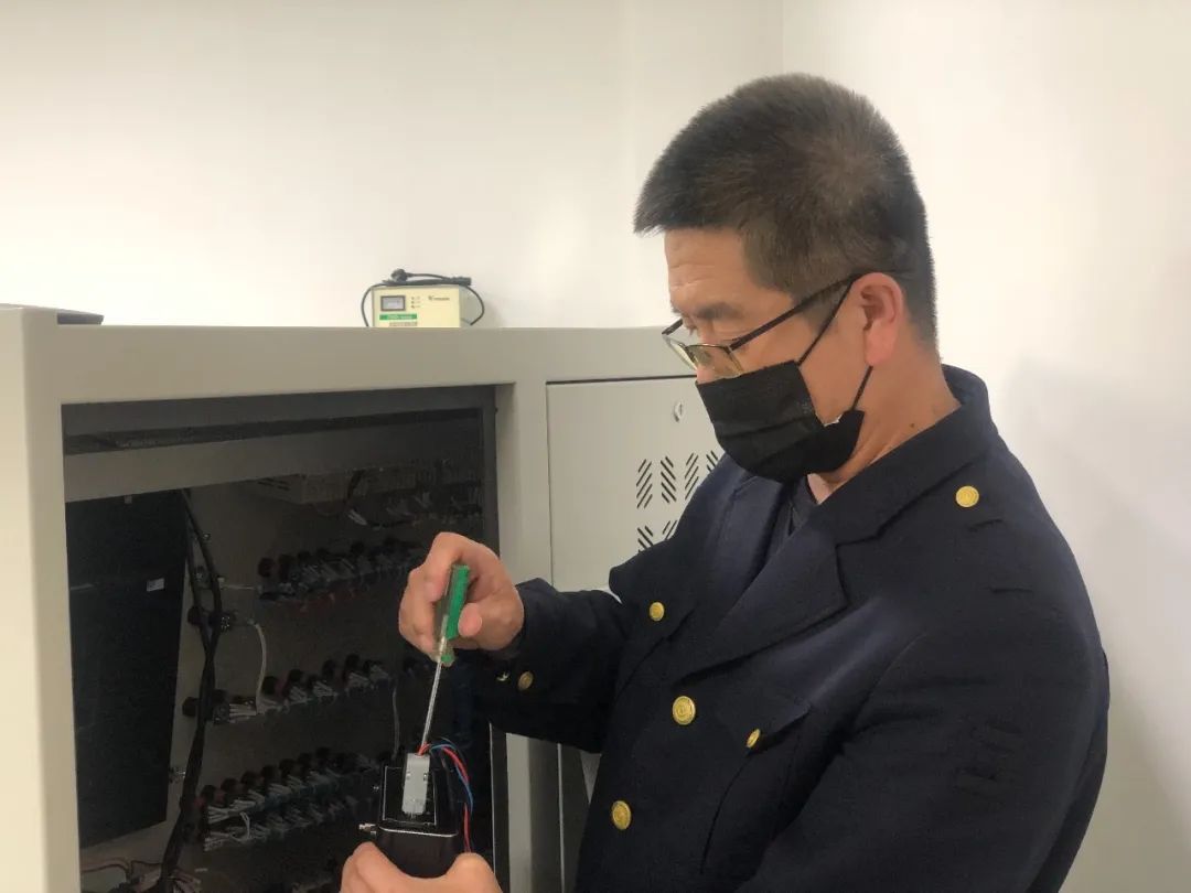 包头检修车间工长刘焕成正在更换检修测试台模块
