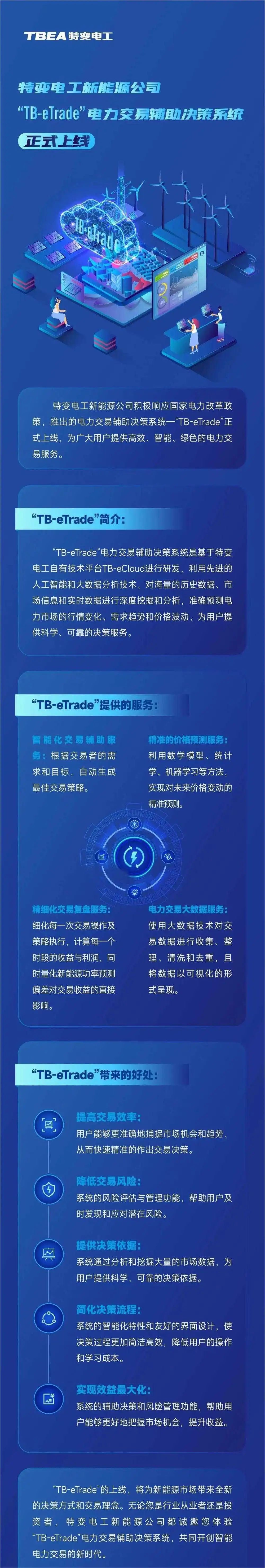 特变电工新能源公司积极响应国家电力改革政策,推出的电力交易辅助决策系统-“TB-eTrade”正式上线,为广大用户提供高效、智能、绿色的电力交易服务。
