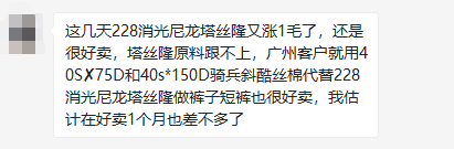 “这几天228消光尼龙塔丝隆又涨1毛了,还是很好卖,塔丝隆原料跟不上,广州客户就用40S*75D和40s*150D骑兵斜酷丝棉T400代替228消光尼龙塔丝隆,这个热度起码还要持续一个月。”一位纺织老板说道。