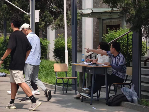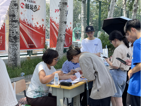 发放现场秩序井然。有老师在一旁登记,旁边的空地上也摆满了军训服装,学生们以班级为单位交钱并领取。