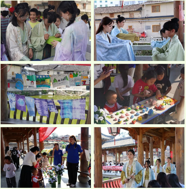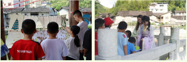 接着,祥源桥上开展了汉服主题游园会,有“穿针引线”“投壶挑战”“礼仪模仿秀”“看图识汉服”等4个活动,供师生、游客打卡游玩。同时,在祥源桥中心展示支教师生和杨源中心小学学生们共同完成的手工作品,包含茉莉花、茶杯茶具、中式糕点等手工成品以及色彩速写、非遗扎染、植物拓染、硬笔书法等作品,展现孩子们的奇思妙想、无限创新,传承中华优秀传统文化,引得游客们驻足参观,拍照打卡。