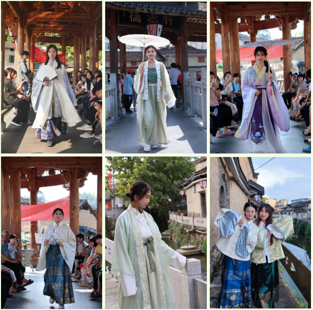 鲤鱼溪沿岸,清波荡漾,景色宜人。汉服巡游共展出20套汉服,均为闽江学院服装学院师生结合传统元素原创制衣,20名参演模特由服装学院支教队员与杨源小学高年级学生组成,她们身着翠微、欧碧、窃蓝、紫蒲、凝脂等5种中国传统色系的汉服,伴随着温柔婉转的国风音乐行走于水榭亭台上,穿梭于石板廊道间,漫步在鲤鱼溪两岸,每一步都充满了文化自信和历史情怀,他们以实际行动诠释了“传承、创新、实践”的精神内涵,为推动汉服文化的发展和传播做出了积极贡献。