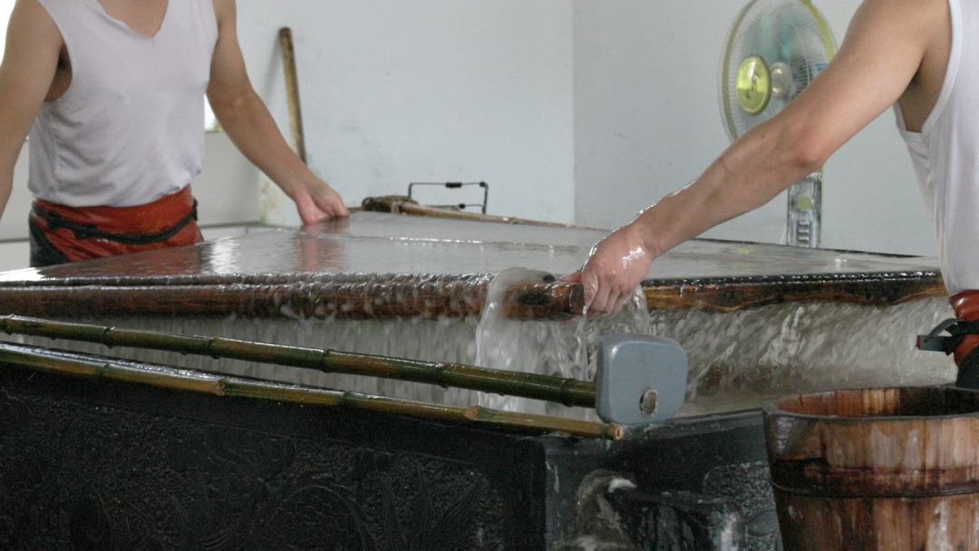 移步宣纸制造车间,队员们近距离观看了宣纸制作的全套流程:宣纸的原材料苇草被割下后,经过晾晒和浸泡的处理,然后送至车间。工艺师傅们通过多次磨浆和筛选的过程,将草浆制成纸浆。下一个车间的制作师傅将纸浆均匀地涂抹在特制的纸帘上,使用宽大的毛笔在纸帘上涂抹纸浆。这个过程需要快速而准确的手势和节奏,以确保纸浆均匀分布。接下来,工艺师傅会将浸泡在水中的纸浆和纸帘一起抬起,使纸浆逐渐在纸帘上凝结成纸,并使用水和刀将多余的纸浆去除,使纸张更加均匀和透明。最后,制作出的湿宣纸会被置于阴凉通风的地方初步晾干,再由晾纸师傅贴于特制的纸焙上烘干。