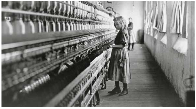 工厂里工人工作的环境单调、危险、不卫生,纺纱机的运作部件没有保护装置,因此操作风险高。许多工人被迫长时间工作,却只得到很低的工资。孩子们需要工作来增补家庭开支,童工现象非常普遍。
