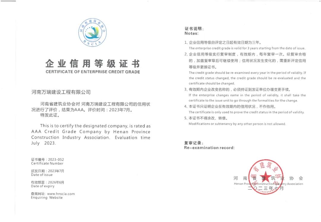 近日,河南省建筑业协会公布了2023年度河南省建筑业AAA级信用企业评选结果,经严格审核及综合评价,公司荣获“河南省建筑业AAA级信用企业”称号。