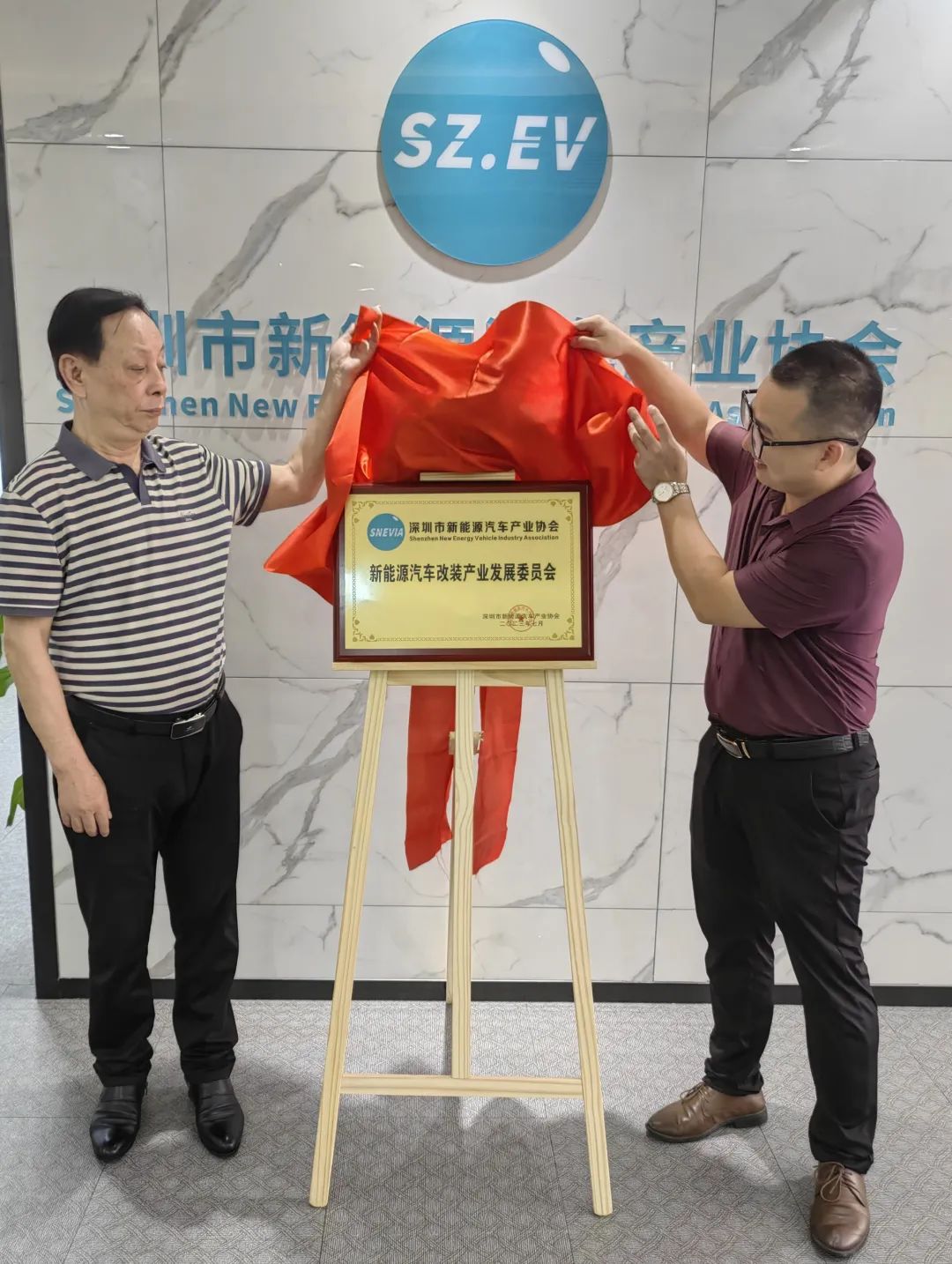 ▲深圳市新能源汽车产业协会刘华会长(左)与新能源汽车改装产业发展委员会执行主任张远(右)共同揭牌