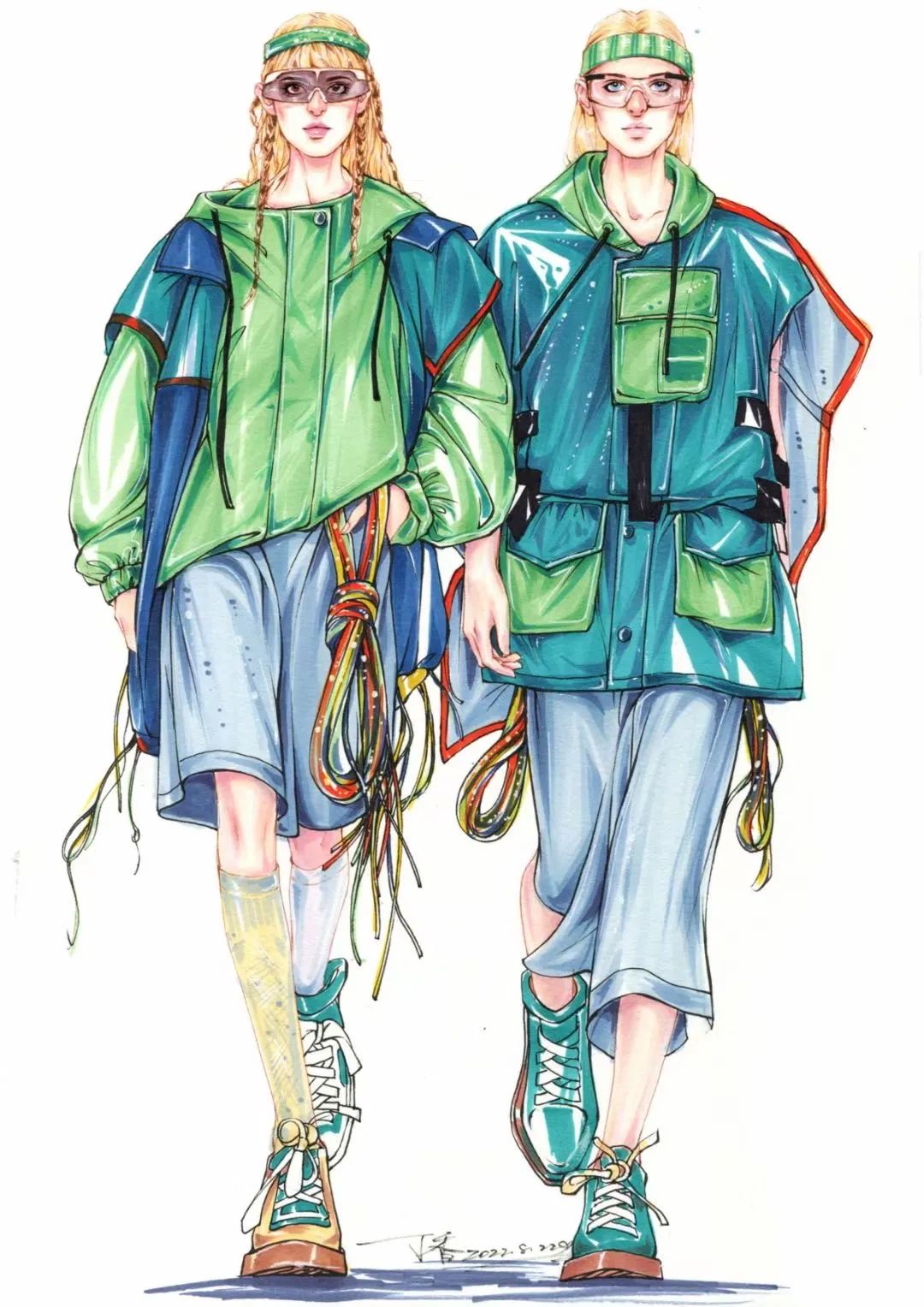 ? 服装结构表达是画面的重中之重。无论你是水彩表现手法还是马克笔表达方式,清晰有层次、有节奏的表达出服装结构,如衣褶的走向,人体呈现在服装上的形态,光影的表述,不需要一一深入刻画,整体效果图有明暗体积的表达关系即可。