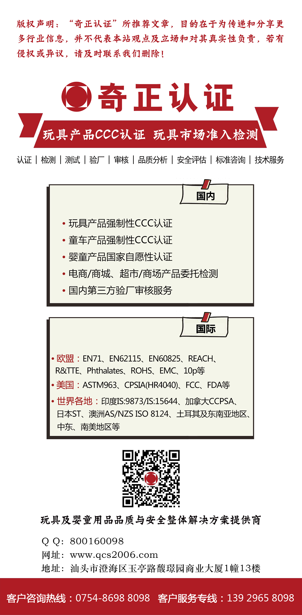 奇正始创于 2006 年,旗下设立多个技术服务分支机构、产业科研实验室及技术中心,专门为玩具企业及婴童企业的产品开发、运营、销售、贸易提供品质及安全的全过程技术支持与全产业链专业服务。基于专业技术经验和深厚服务能力,奇正以成熟的解决方案和专业的知识技能满足玩具及婴童企业在国内市场与国际贸易持续发展的需求。