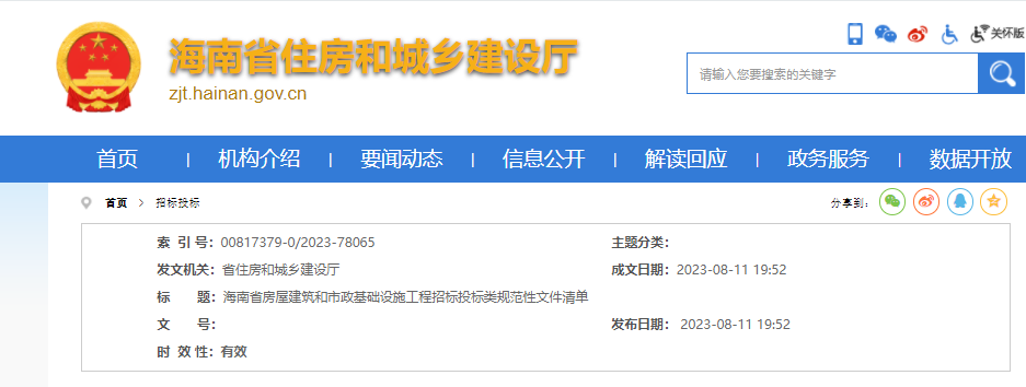 海南省房屋建筑和市政基础设施工程招标投标类规范性文件清单(现行有效)
