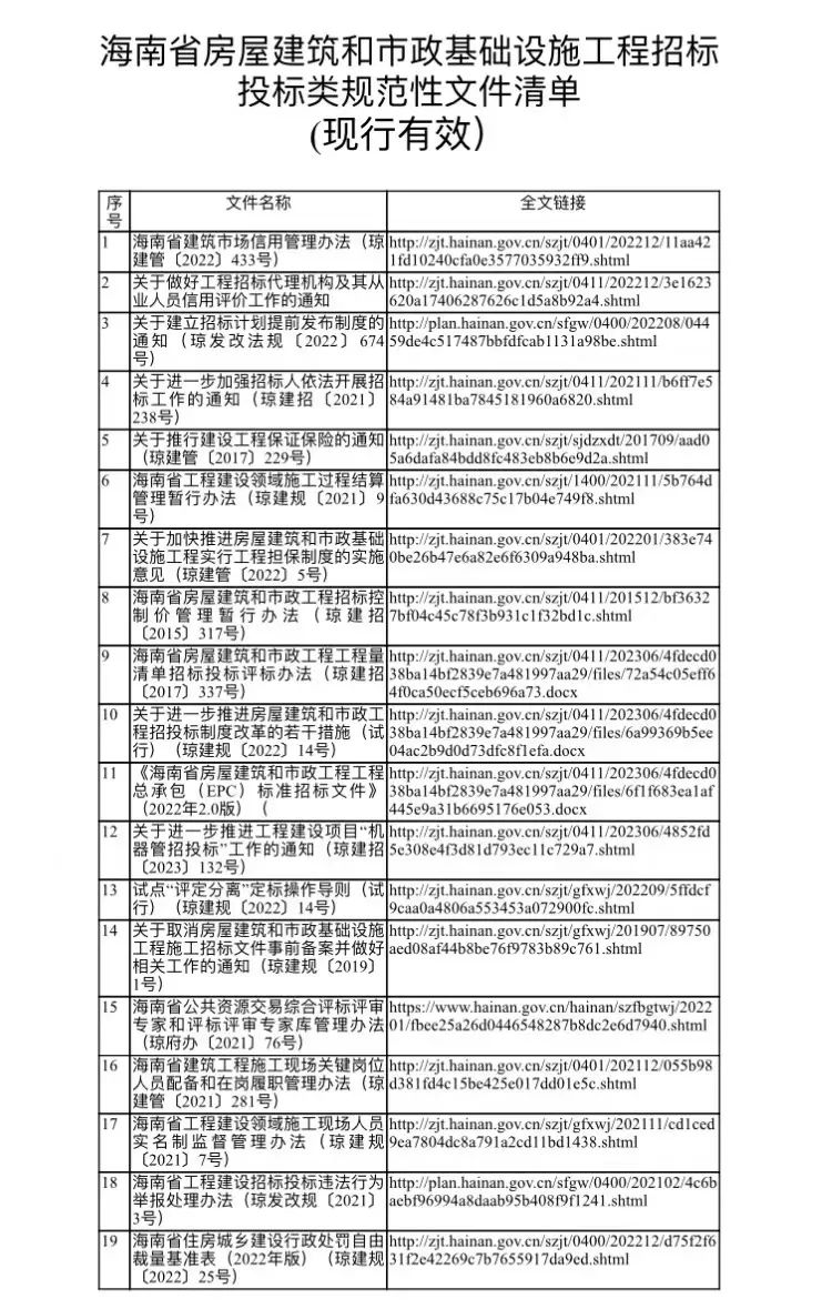 海南省房屋建筑和市政基础设施工程招标投标类规范性文件清单