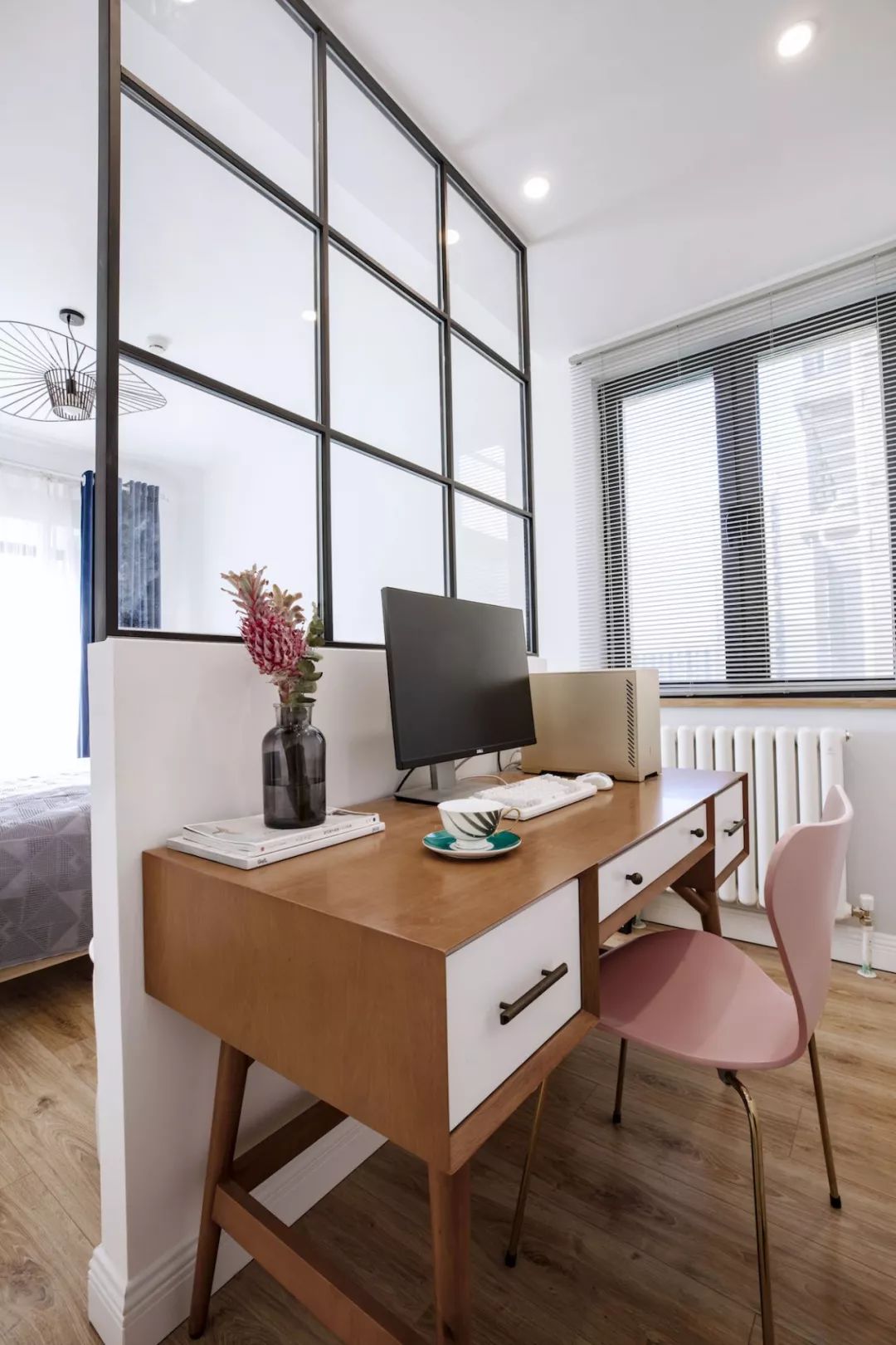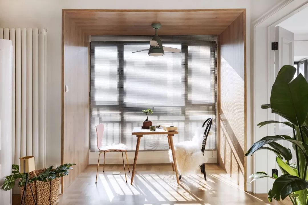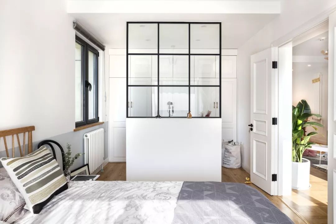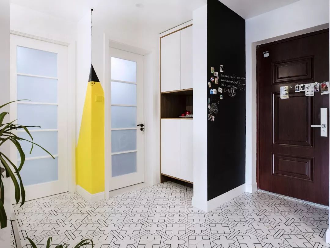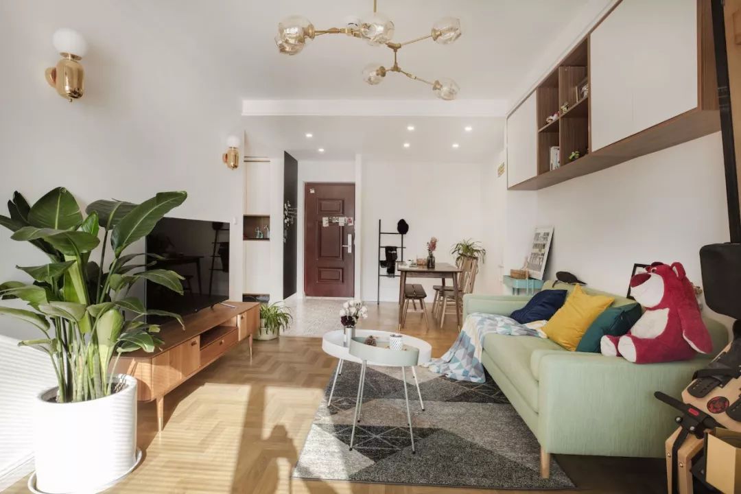玄关一组标配鞋柜,设计师画的灯不仅处理了风水问题,也提升了这部分区域的设计感。进门右手边设计了一面黑板墙,满足业主需求,花砖地面增添室内北欧格调。餐厅的设计很简单,留白墙面搭配木质餐桌椅与长凳,平整的顶面用筒灯代替吊灯。客厅色调以绿色为主,以黄、蓝、粉为点缀色,添加了铜元素和木制品。客厅的软装单品都是采用了一些比较简单典型的北欧搭配。原本阳台上有一道梁,为了规避这道梁,将阳台做成地板围合的一个小型休闲空间。左侧粉红的椅子是7号椅,右侧则采用了维也纳椅。留白的电视背景墙装一对金色壁灯,对面沙发上方木作壁挂储物柜,既可以作为书架,也可以用作展示柜。厨房地面拼贴黑白花砖,墙面采用白色瓷砖工字铺贴,白色橱柜金色拉手,细节中点缀品质。卧室木地板搭配灰色墙裙背景,实木大床,一边做了床头柜,一边则用一把维也纳椅代替,并将卧室阳台设计成休闲区。原始户型中主次卧都比较小,由于只有夫妻俩居住,设计师将主次卧打通,改造成了一个套间,中间做了玻璃隔断。通过玻璃隔断墙作分隔,在后方打造出一个简易工作区。卫生间干湿分区,加宽了卫浴柜的空间,同时也满足女主化妆的需求。卫生间湿区采用黑白配,简单大方,浅色是后退色,会让本来不太大的空间显得不再拥挤。--------------------------