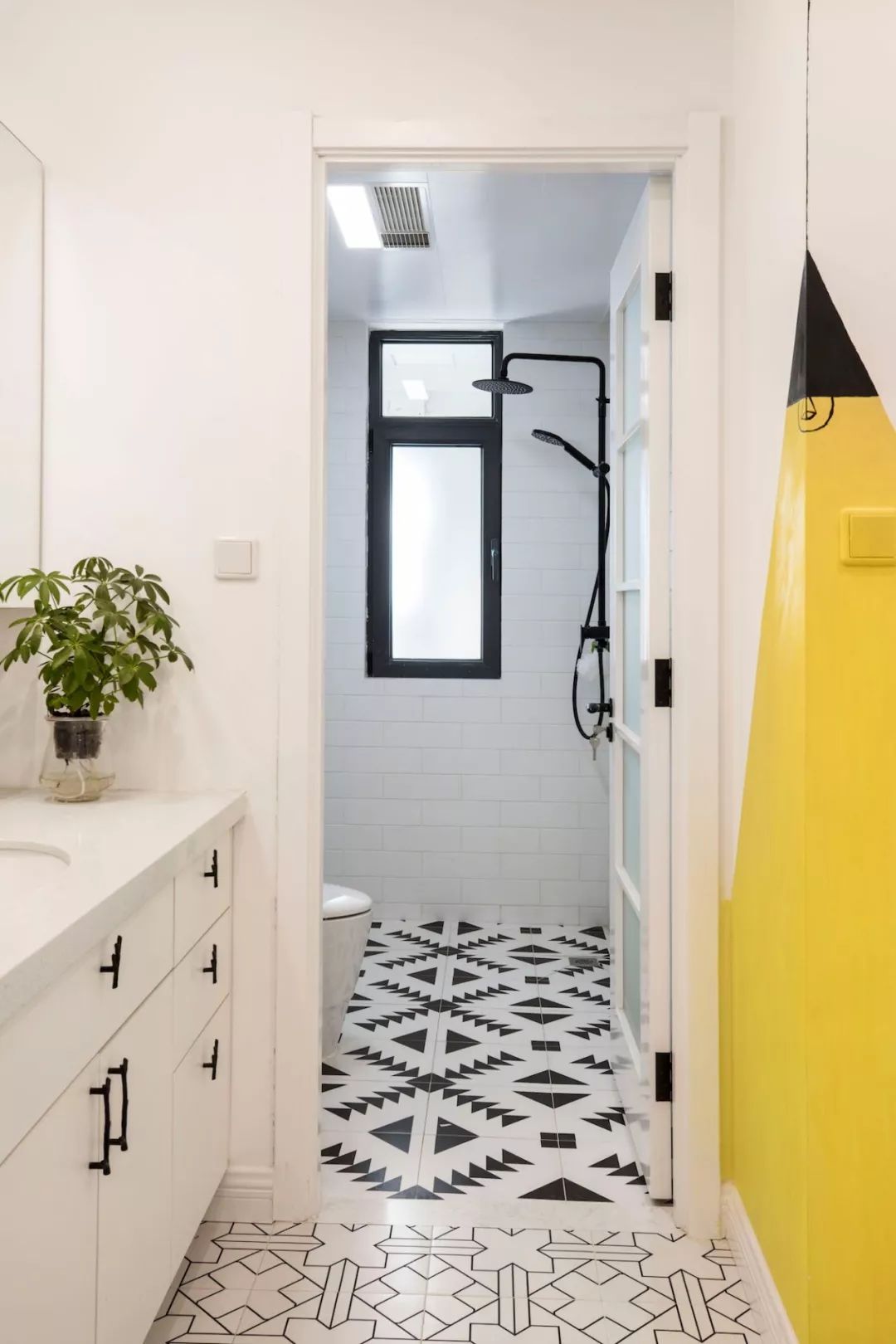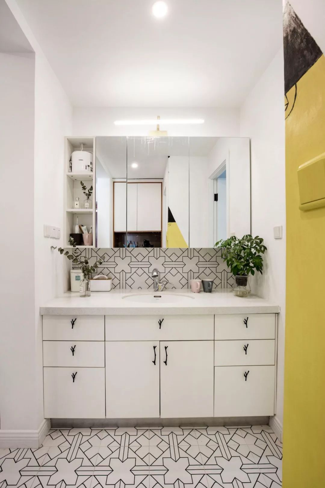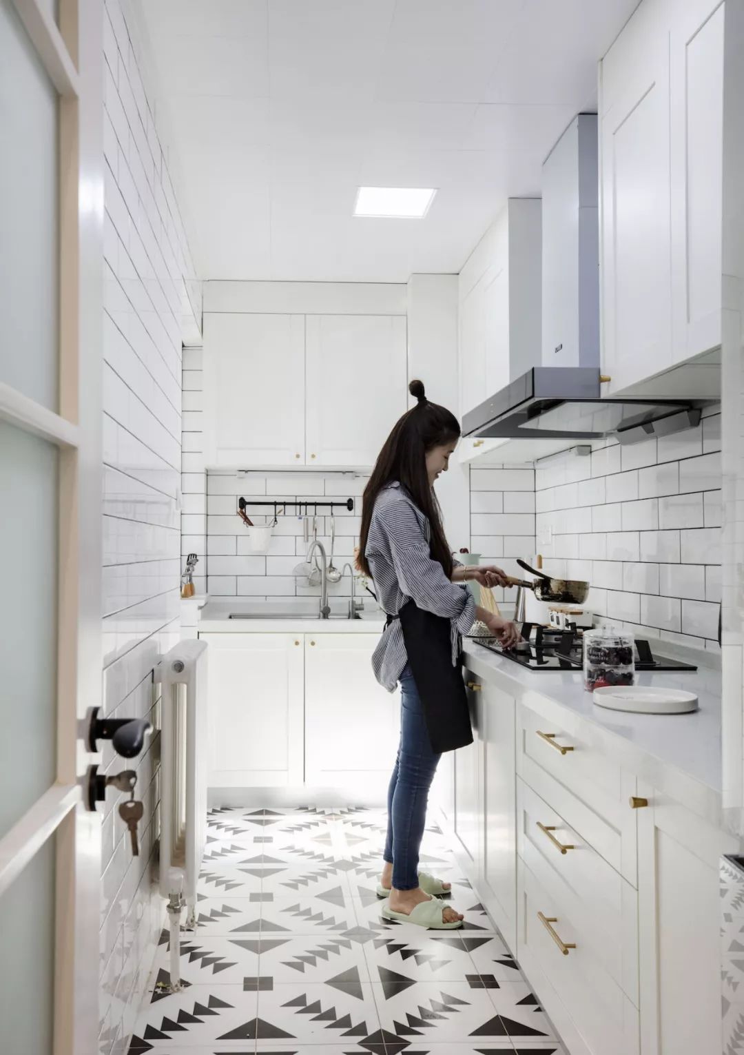 玄关一组标配鞋柜,设计师画的灯不仅处理了风水问题,也提升了这部分区域的设计感。进门右手边设计了一面黑板墙,满足业主需求,花砖地面增添室内北欧格调。餐厅的设计很简单,留白墙面搭配木质餐桌椅与长凳,平整的顶面用筒灯代替吊灯。客厅色调以绿色为主,以黄、蓝、粉为点缀色,添加了铜元素和木制品。客厅的软装单品都是采用了一些比较简单典型的北欧搭配。原本阳台上有一道梁,为了规避这道梁,将阳台做成地板围合的一个小型休闲空间。左侧粉红的椅子是7号椅,右侧则采用了维也纳椅。留白的电视背景墙装一对金色壁灯,对面沙发上方木作壁挂储物柜,既可以作为书架,也可以用作展示柜。厨房地面拼贴黑白花砖,墙面采用白色瓷砖工字铺贴,白色橱柜金色拉手,细节中点缀品质。卧室木地板搭配灰色墙裙背景,实木大床,一边做了床头柜,一边则用一把维也纳椅代替,并将卧室阳台设计成休闲区。原始户型中主次卧都比较小,由于只有夫妻俩居住,设计师将主次卧打通,改造成了一个套间,中间做了玻璃隔断。通过玻璃隔断墙作分隔,在后方打造出一个简易工作区。卫生间干湿分区,加宽了卫浴柜的空间,同时也满足女主化妆的需求。卫生间湿区采用黑白配,简单大方,浅色是后退色,会让本来不太大的空间显得不再拥挤。--------------------------