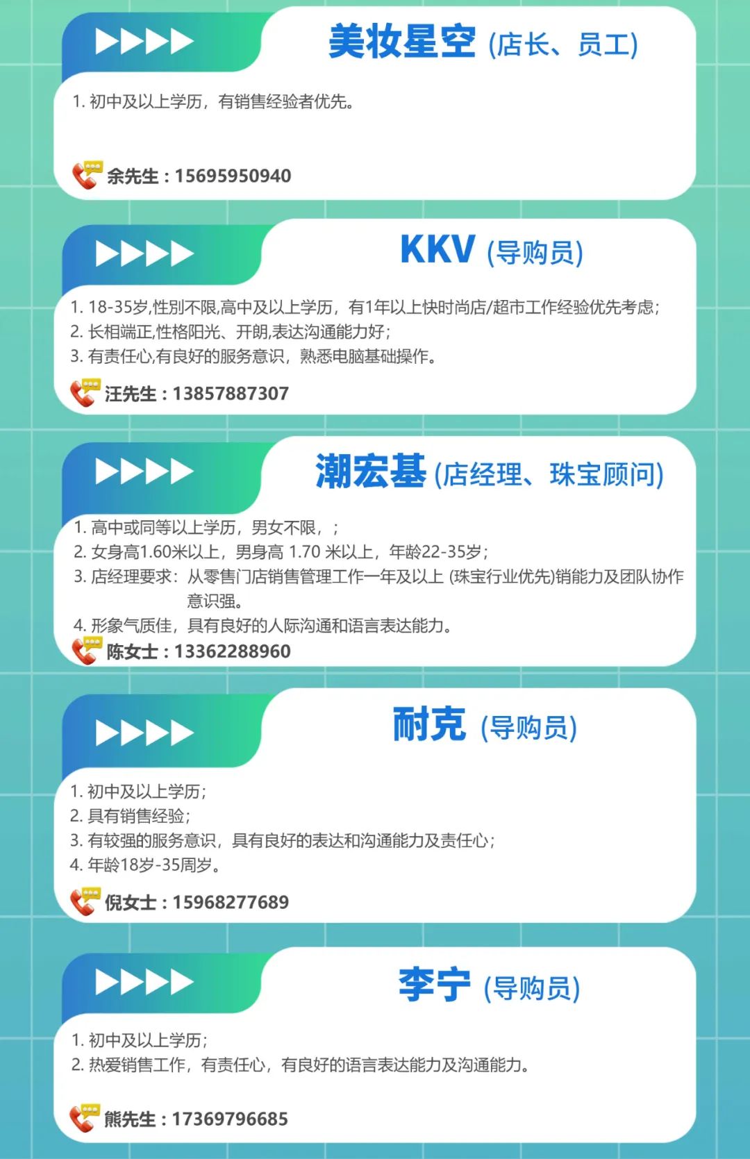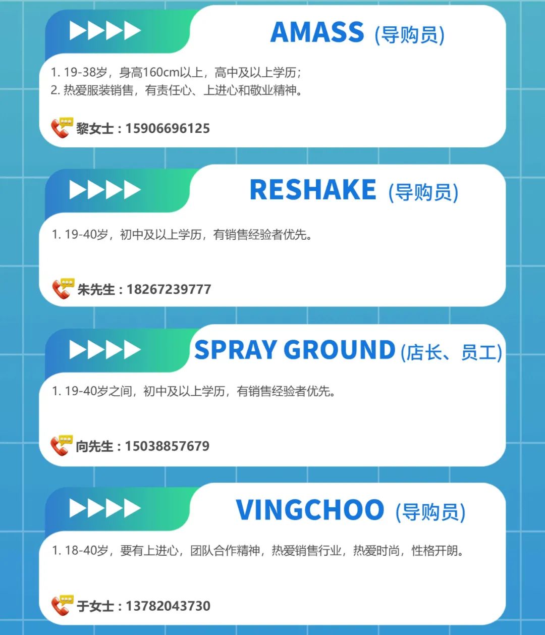 应聘请查看图片中各品牌联系方式