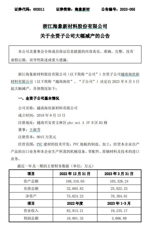 因美国海关的溯源要求,海象新材全资子公司越南海欣决定自2023年8月4日起大幅减产。