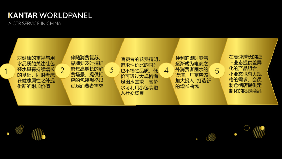 凯度消费者指数在7月的2023中国包装饮用水峰会上发布了2023年包装水市场趋势报告,提炼出以下五大机会点,帮助品牌们制胜包装水市场。
