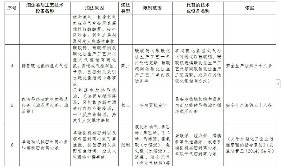 淘汰落后的设备包括4种:储存硫化氢的湿式气柜,设为禁止类,要求碳酸锶间歇碳化法生产工艺一年内改造完毕,碳酸钡间歇碳化法生产工艺二年内改造完毕;内注导热油式电加热反应釜(油浴反应釜、油浴锅),设为禁止类,要求一年内更换完毕;单端面机械密封离心泵和填料密封离心泵,设为限制类,液化石油气、氯乙烯、苯乙烯、丁二烯、丙烯腈、氢氰酸(水溶液)、氟化氢(水溶液)、液氯、液态光气(含光气物料)等液化烃及易自聚、有毒液体的介质输送禁用,要求六个月内更换完毕;人工卸料平板离心机和人工卸料板框压滤机,设为限制类,涉及易燃、有毒物料的设备禁用,一年内更换完毕。
