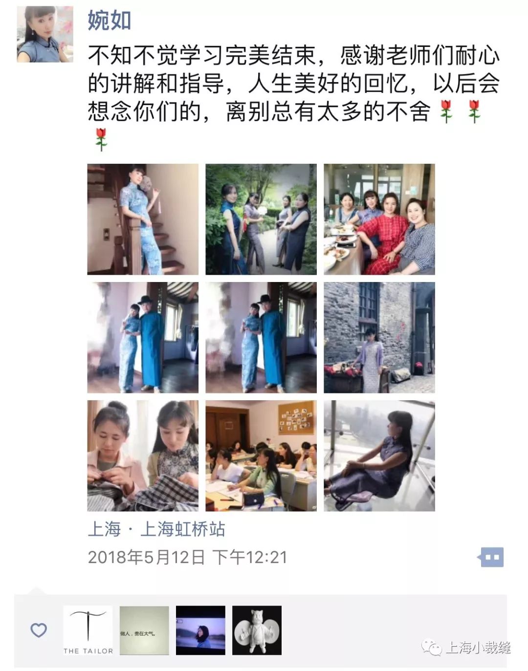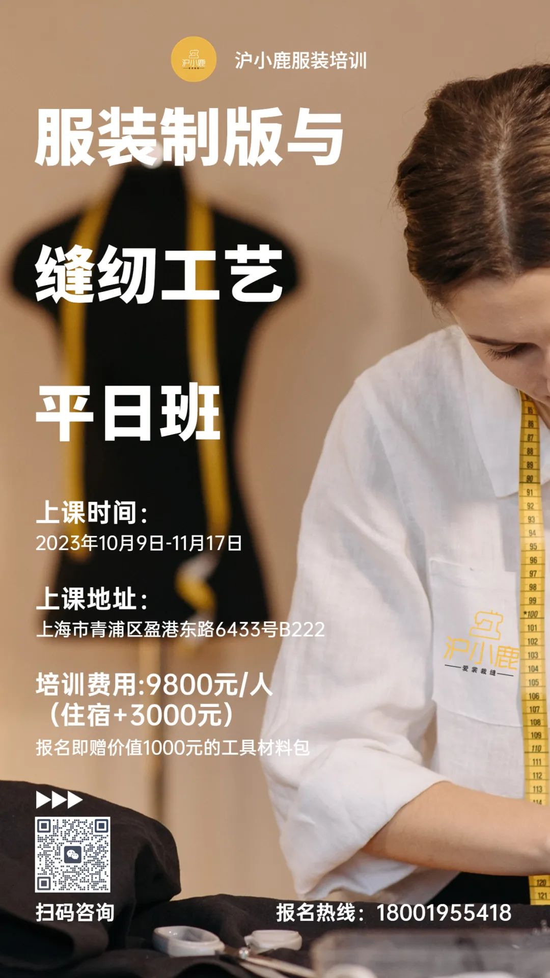 •上课时间:上午9:30~12:00,下午13:30~17:00(周一至周五)•课程形式:8人小班制(1对1辅导,照顾到每一位学员)•学费:9800元(报名即送工具包和课件练习白胚布)毕业于上海纺织工业大学服装设计与工程,1997年开始从事服装制版与工艺技术工作,近20年的服装从业经验,先后服务于国内一线服装品牌,KAKO、EMI'S、Broadcast播、舒朗、曾任CC&DD技术经理。2014年从事服装制版与工艺培训至今采用跟学员互动的一对一辅导模式,创意与实践相结合,将自己的经验总结编制成服装制版教材,去繁求简,让学员们在学习服装制版时少走弯路,帮助每一位学员深入学习理解服装版型的精髓。 十多年的服装制作经验,曾任马克华菲/Mark Fairwhale样衣师,精通各类时装制作流程,擅长真丝类服装制作,旗袍制作,工匠级的服装工艺技术,对工艺精益求精,探索出各种服装的创新工艺,让工艺不再繁琐。2016年加入上海小裁缝设计工作室任教,主讲服装缝纫与工艺,以其独特的耐心与细致深受学员们的好评。•服装结构制图类基础知识,学习服装号型、量体、制图的概念、原理、种类及应用,样板的认知,了解服装样板中常用的代号和符号。•女体的体型与测量,了解女体各部位净体尺寸以及各种款式的放松量。•裙原型的制作,裙与人体的体表关系,裙装的结构设计与制图,具体款式分析与制图(直筒裙、包臀裙、A字裙、喇叭裙、鱼尾裙、蛋糕裙、插片裙、百褶裙等)。•上衣与人体的体表关系,省褶概念及省位转移与变化;•各种衣领(立领、翻领、翻立领、西装领、青果领、荡领、帽子等)的结构制版与工艺设计;•各种袖子(一片袖、两片袖、泡泡袖、插肩袖、和服袖等)的结构制版与工艺设计;•各类衬衫、西装、连衣裙、外套夹克、风衣、大衣、T恤、卫衣等的概述与制图以及工艺设计。•掌握手工熨烫的原则、熨烫工艺的基本技法,平烫、起烫、分烫,推、归、拔工艺;沪小鹿服装培训成立于2014年9月(原上海小裁缝),专注服装版型与工艺的研究,分享服装行业的经验与学术沉淀。传承匠心精神,用心教学好品质。我们的口号是:让零基础轻松学会做衣服。工作室地处上海青浦赵巷,交通方便,距离虹桥火车站地铁6站路。工作室先后推出:服装制版与缝纫工艺全日班、海派旗袍高定版型与工艺研习班、服装缝纫工艺周末班、服装平面制版周末班、服装立体裁剪班、双面呢大衣手缝课程……零基础的门槛深得服装手作爱好者的喜爱并学得一身精湛手艺从这里走出,很多学员都创建了自己的品牌和工作室。越来越多志同道合以及专业人士加入进来,在保证小班授课以及一对一辅导的前提下我们的课程越来越丰富多彩。- 地址:上海市青浦区盈港东路6433号8090青年创业基地A510
