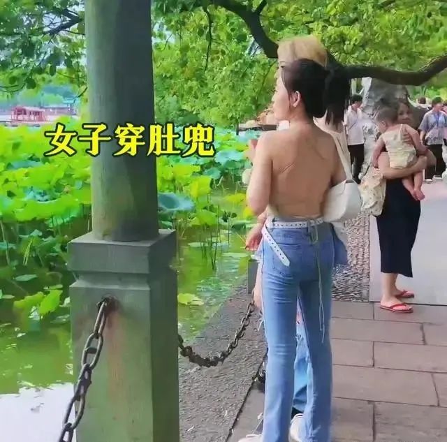 8月1日,有网友在游西湖的时候,就亲眼看到了两个衣着奇特的女子,其中一名女子穿着露背装,应该是把肚兜外穿了,另一名女子则穿着半腿裤。