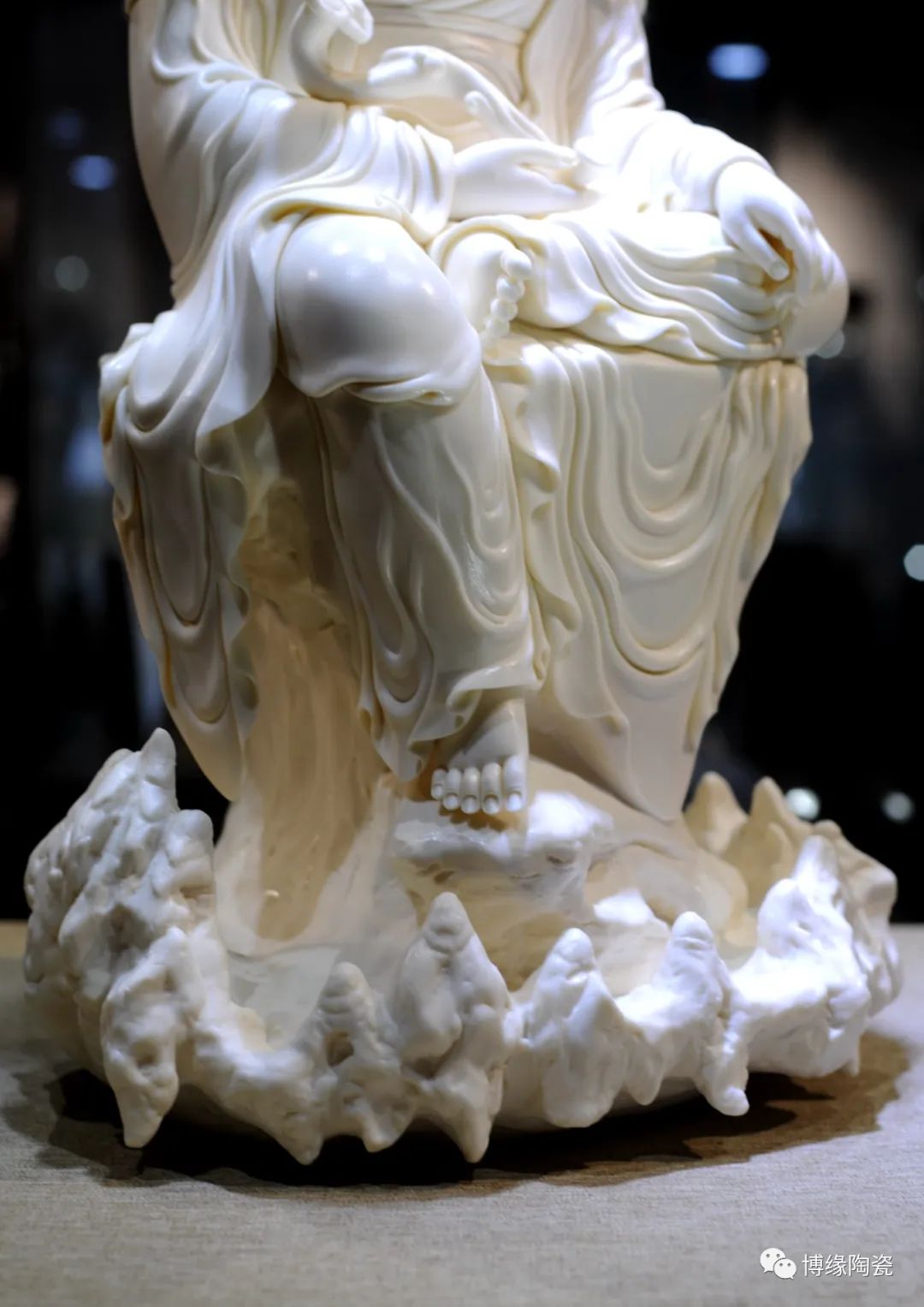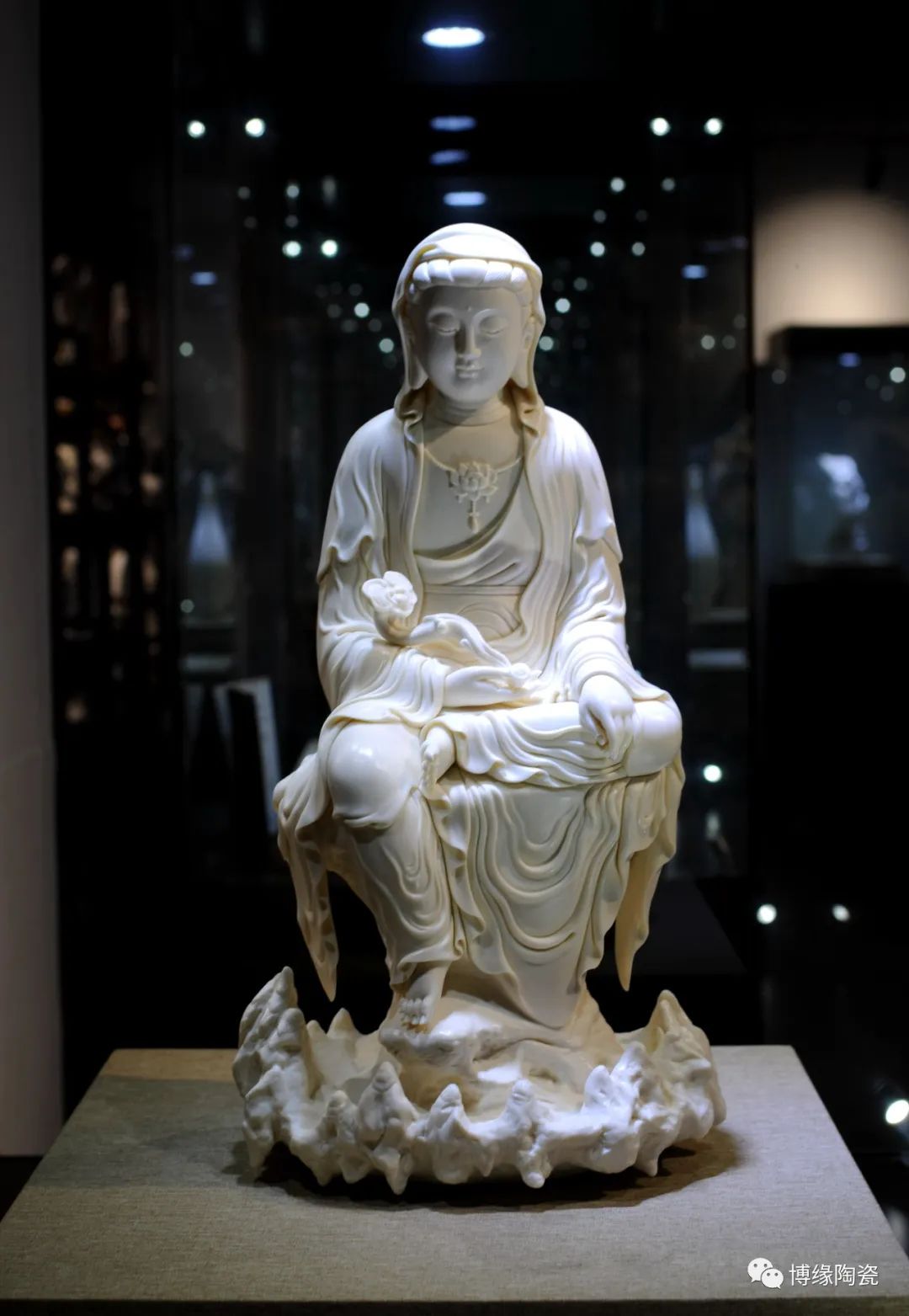 《如意观音》由福建省工艺美术大师林建平设计创作。作品以德化温润如玉的 “玉黄瓷”为胎质,经1300多度高温烧制,胎体温润如玉,瓷感细腻。作品可见观音坐于岩石之上,右脚轻踏,盘坐于岩石上,右手握如意,左手置于左腿上,其姿态突现了观音流畅的线条和优美的身段,衣纹线条优如水波,底部岩石如滴水,体现出观音上善若水,整件作品细腻,祥和。作品背后落有大师签名及印章款,限量发行199件,每件作品有唯一编号,兼具审美价值和收藏价值,是不可多得的雅作。是办公、家居、书房装饰摆设、礼赠、收藏的好选择。