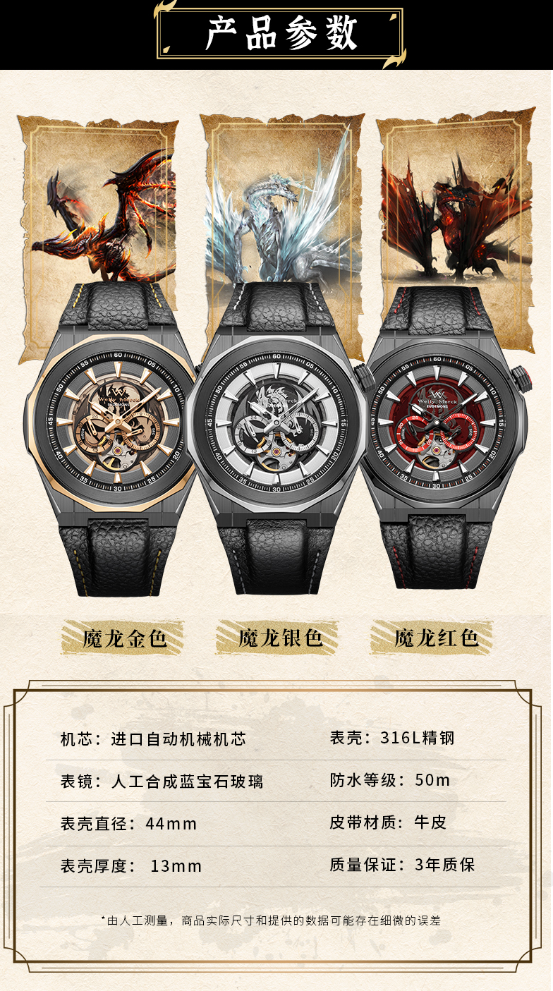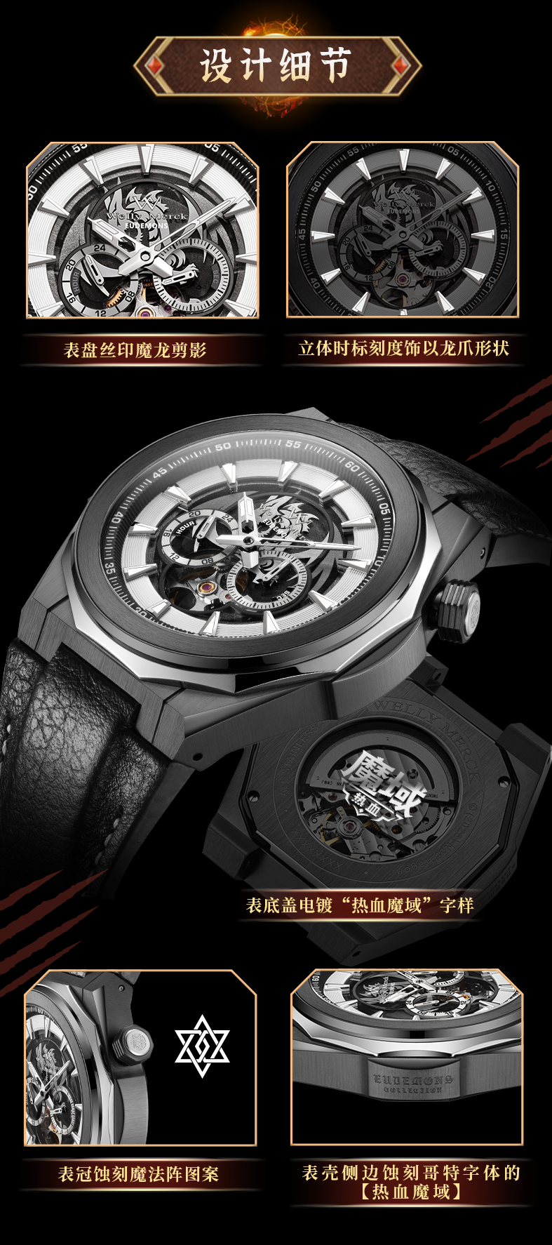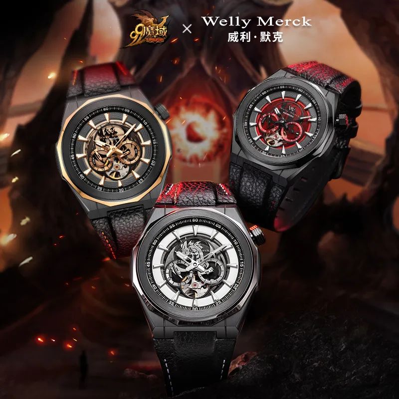 魔龙降临,域火正燃!8月16日起 ,魔域将携手原创设计潮流腕表品牌 WellyMerck(威利默克)推出3款联名机械表。