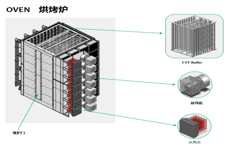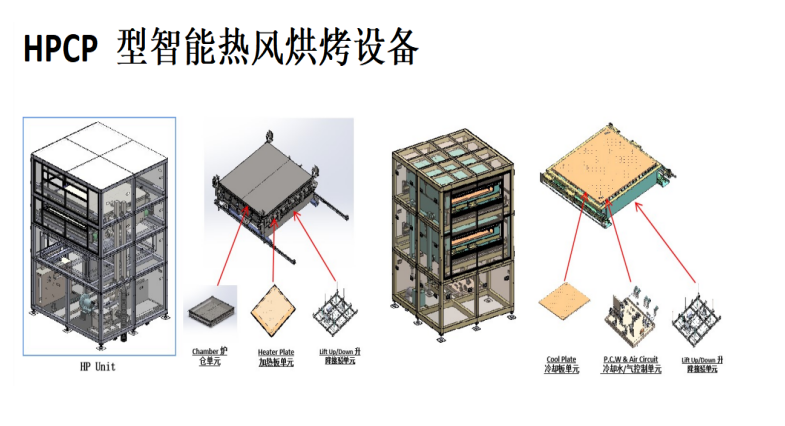 HPCP型智能热风烘烤设备,是国内首台具有自主知识产权的TFT-LCD面板玻璃基片烘干设备,利用多模块加热装置,达到整板的温度设定及均一性,表面温度差异控制在±2℃内,通过升降机构可以搭配其他设备进行上下游设备间的物流移动,设备本身设定运行程序、控制程序、监控程序等,在工艺进行间可以判定异常状态后,进行停止投入及报警。其难点为温度控制及温控精度,并且保证设备进行过程,不出现致命不良和破片。Oven高温热风烘烤设备,是国内首台具有自主知识产权的TFT-LCD面板玻璃基片烘烤设备,温度在120℃~280 ℃ ,是用于曝光显影后工序,显影后的光刻胶进行高温固化,保证显影后的光刻胶的角度,另外可以增加光刻胶在玻璃上的附着力,为后续的刻蚀和剥离做好基础。