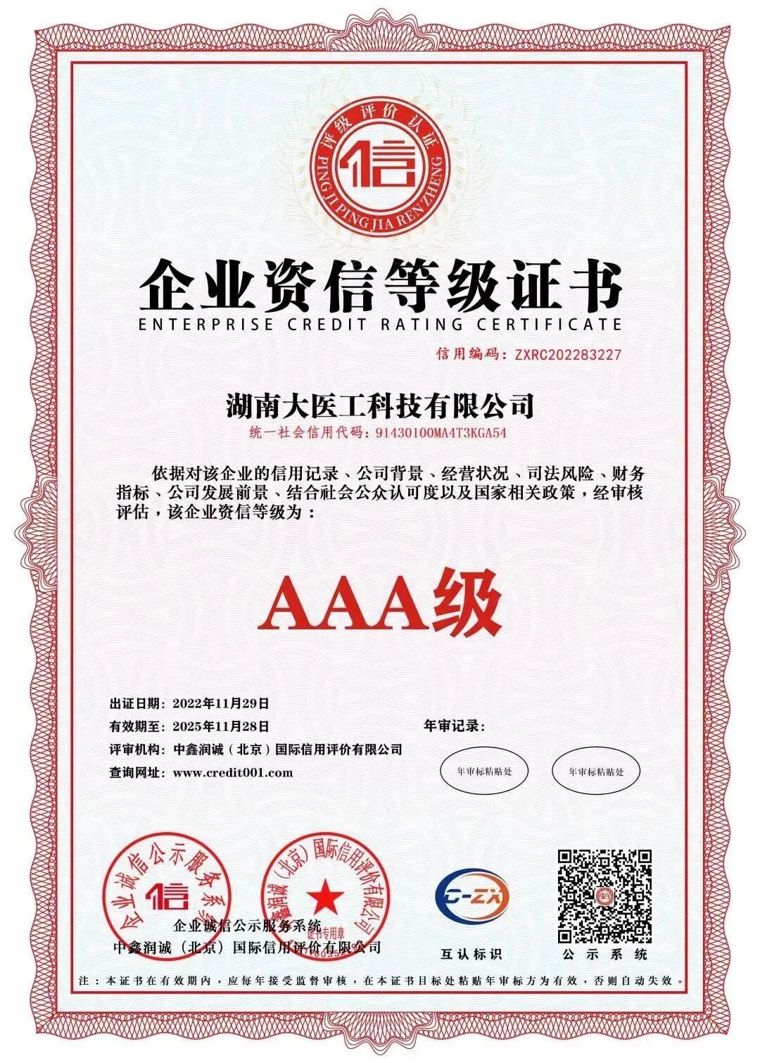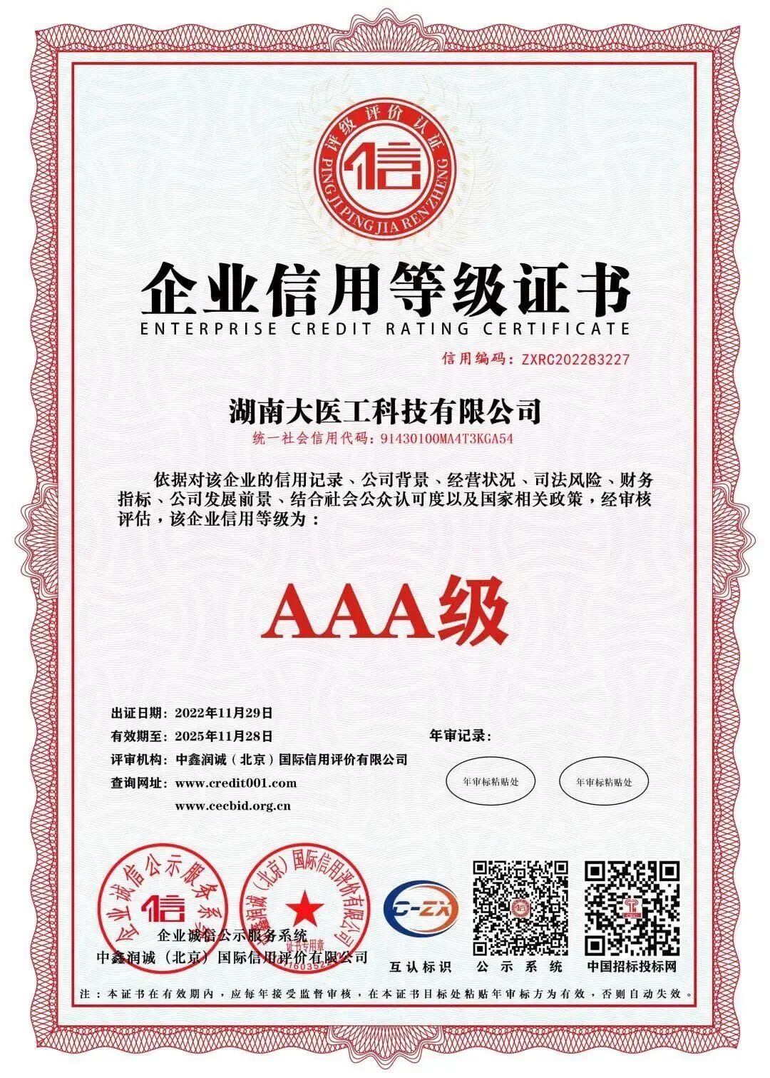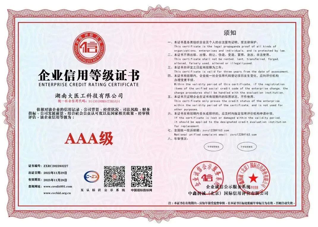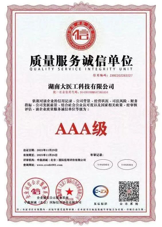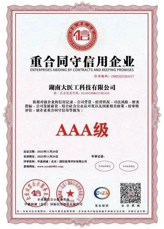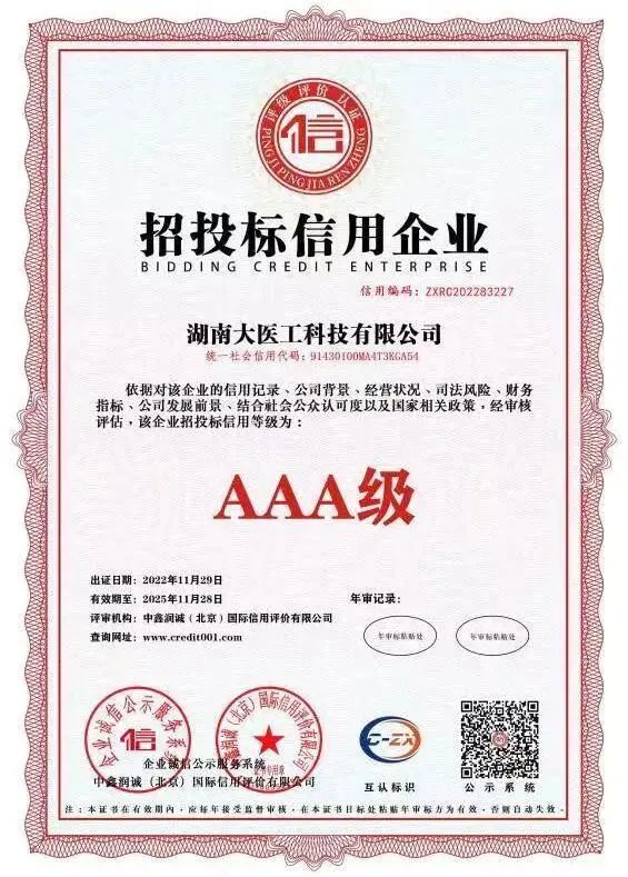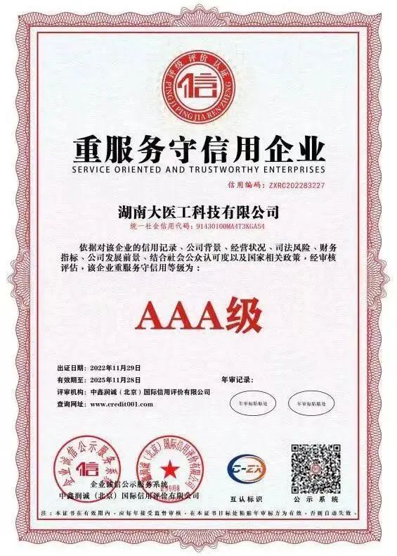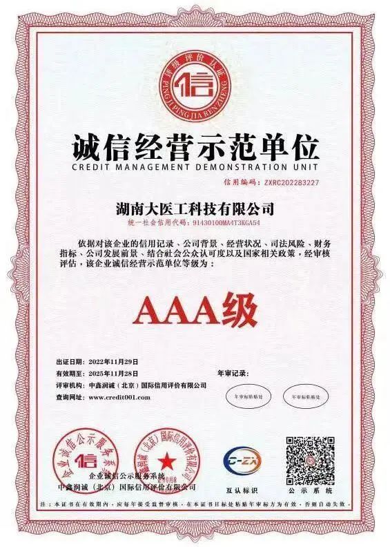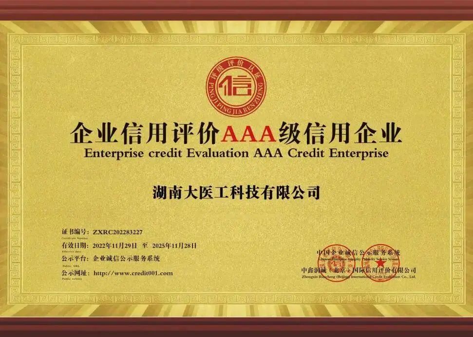 近日,集团旗下湖南大医工科技有限公司在企业信用标准认定中顺利通过AAA信用体系认证,荣获“AAA级企业信用等级证书”、“AAA级重合同守信用企业”、“AAA级诚信经营示范单位”等多项荣誉称号。这是相关权威机构对大医工在规范运营、诚信经营上的认可和肯定。