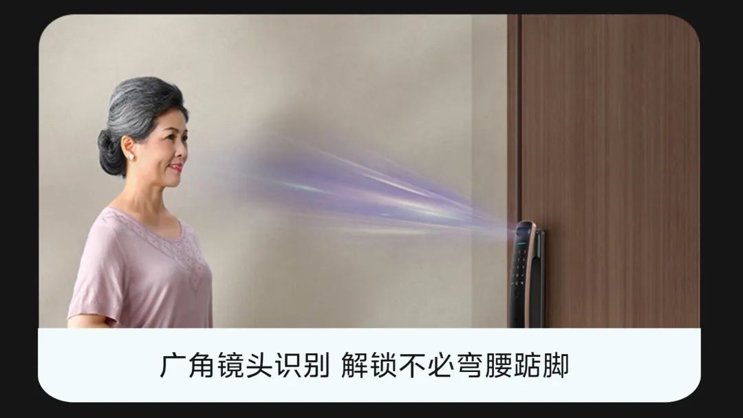 门锁采用3D人脸识别技术,广角镜头识别,解锁不必弯腰踮脚,暗光环境自动补光,刷脸秒开门。