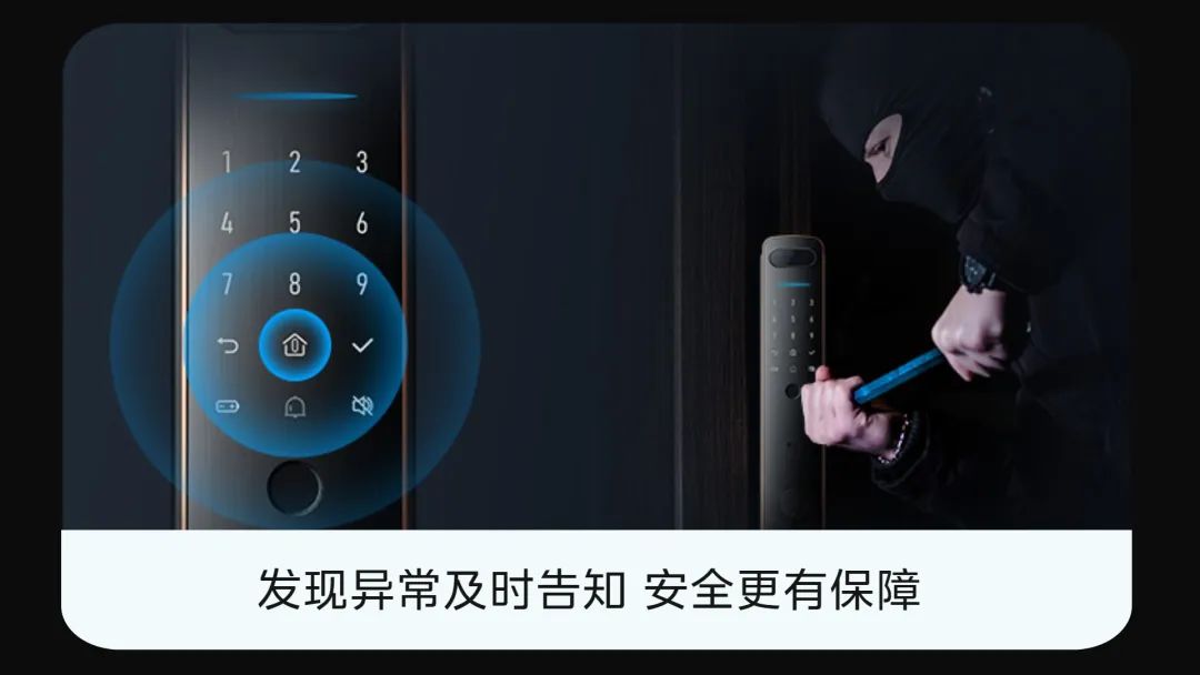 门锁自带雷达感应器,当发现门外人员超时逗留、按下门铃、撬锁、试错开锁等情况,会自动抓拍视频并推送消息至手机APP,让小偷无所遁形;同步支持安全告警,内置防拆感应器,如遇小偷撬动立即推送消息,若坏人多次开锁检验失败,APP推送消息主动报警并锁死锁具,需要90秒后才能再次开启。