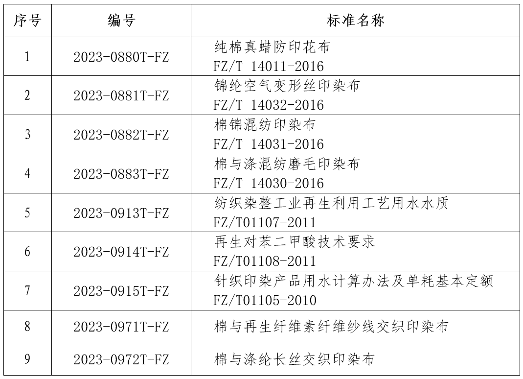 9项印染行业标计划项目如下: