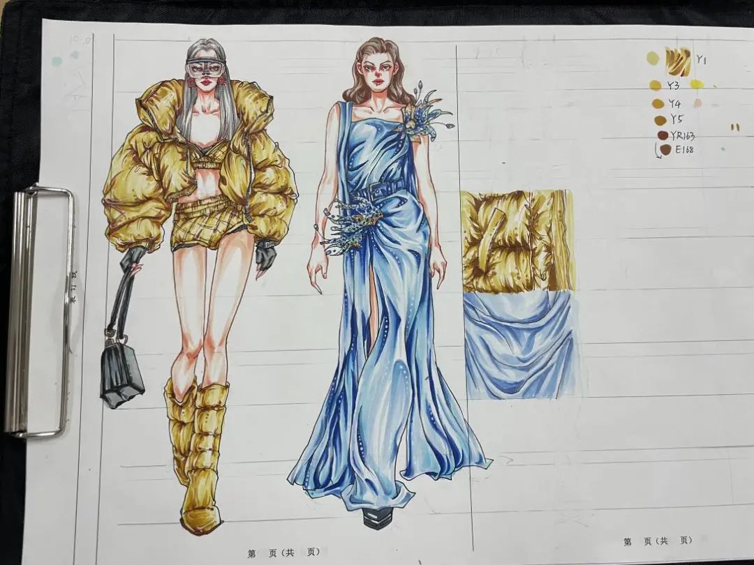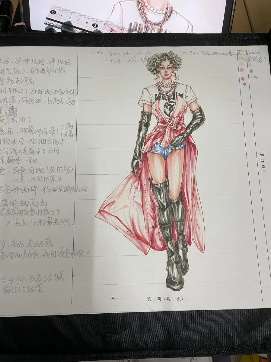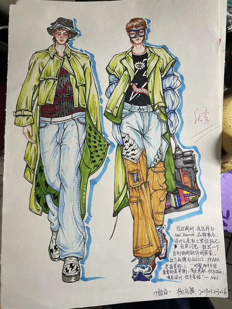 其次,浙理需要正背面款式图、局部设计文字说明、设计说明、甚至是图案绘制,那么就对画面的完整度提出了高要求,临场发挥是很难做到的。所以定稿是必不可少的步骤。