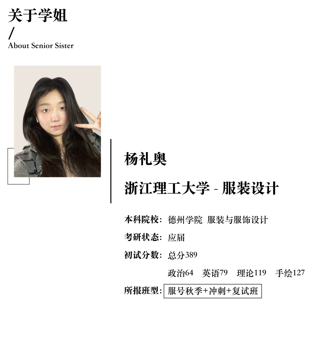 主观原因:我本科就读服装设计专业,经过四年的学习熏陶,更加热爱这个专业,也想要进入高等学府继续深造。而且浙理关注学生个人能力,对于个人风格的包容性很强,我也希望接受非同质化、非工厂化批量生产的艺术教育,成为更好的自己。