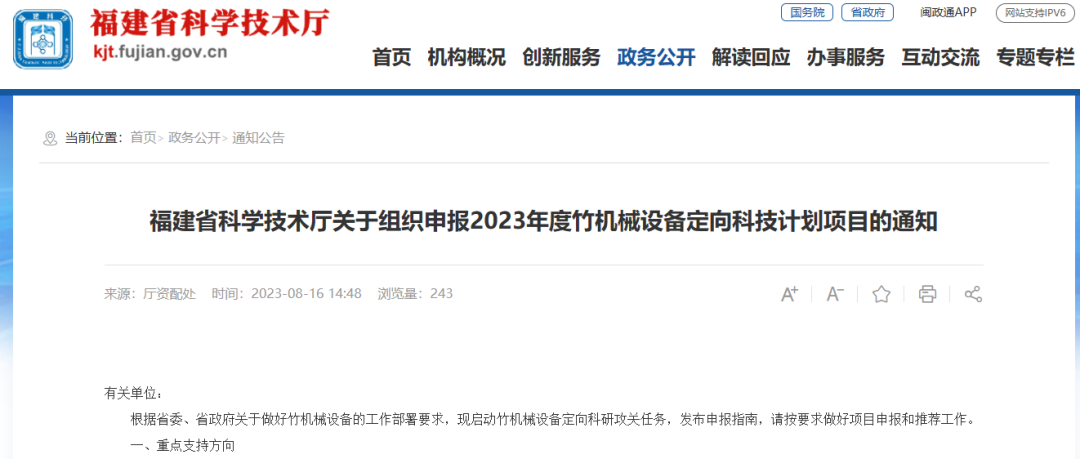 福建省科学技术厅关于组织申报2023年度竹机械设备定向科技计划项目的通知